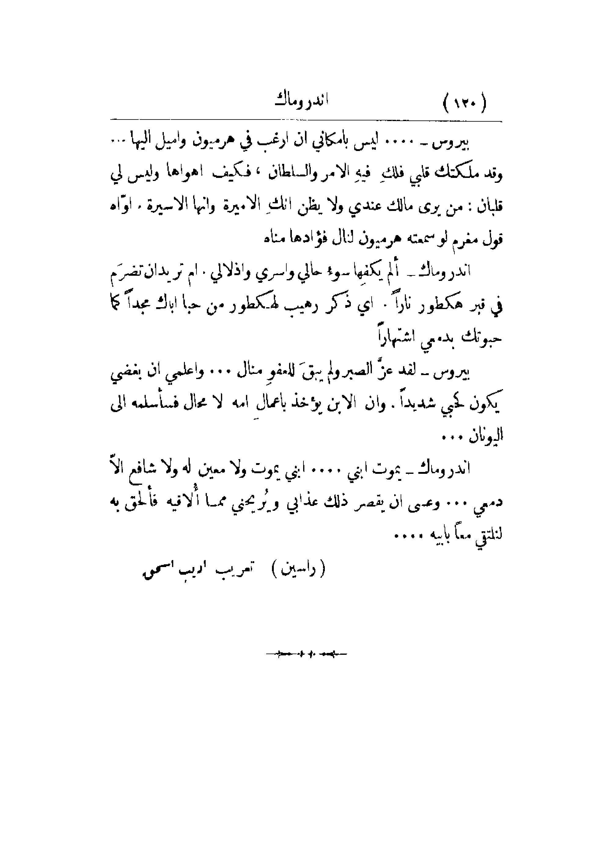 بيروس -. . . ليس بإمكاني أن أرغب في هرميون وأميل إليها. . وقد ملكتك قلبي فلك فيه الأمر والسلطان، فكيف أهواها وليس لي قلبان: من يرى مالك عندي ولا يظن أنك الأميرة وأنها الأسيرة. أواه قول مغرم لو سمعته هرميون لنال فؤادها مناه.