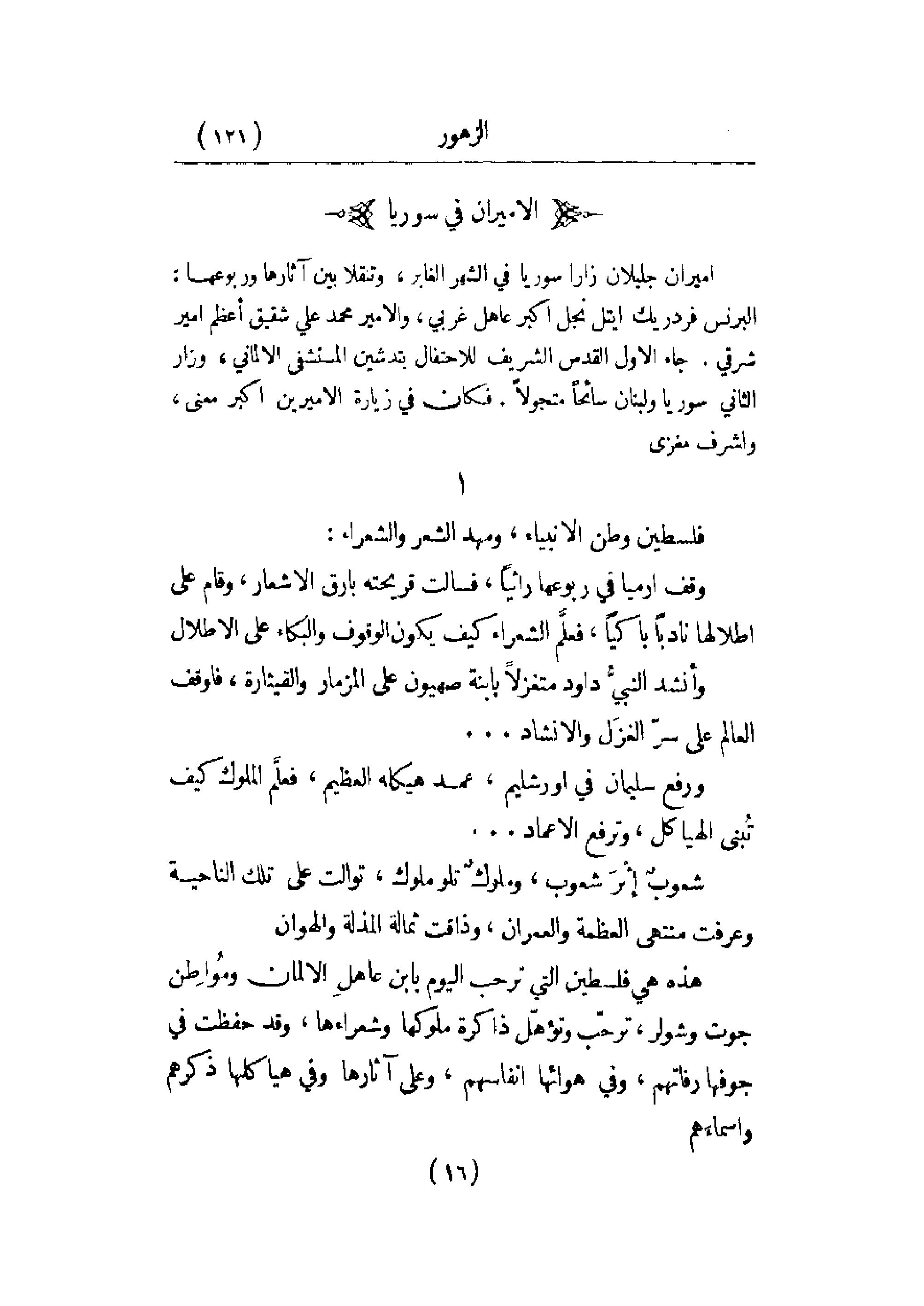 أميران جليلان زارا سورية في الشهر الغابر، وتنقلا بين آثارها وربوعها: البرنس فردريك ايتل نجل أكبر عاهل غربي، والأمير محمد علي شقيق أعظم أمير شرقي. جاء الأول القدس الشريف للاحتفال بتدشين المستشفى الألماني، وزار الثاني سورية ولبنان سائحاً متجولاً. فكان في زيارة الأميرين أكبر معنى، وأشرف مغزى.