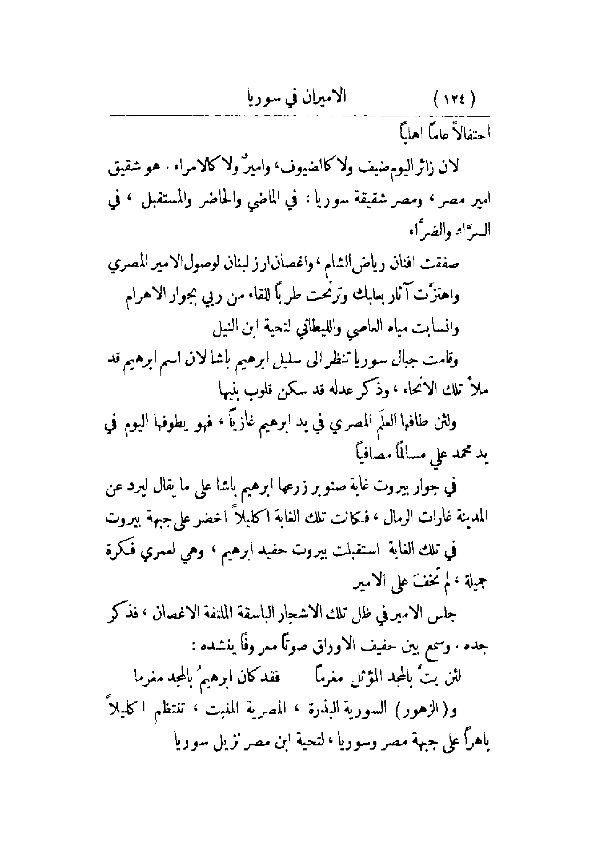 وقامت جبال سورية تنظر إلى سليل إبراهيم باشا لأن اسم إبراهيم قد ملأ تلك الأنحاء، وذكر عدله قد سكن قلوب بنيها