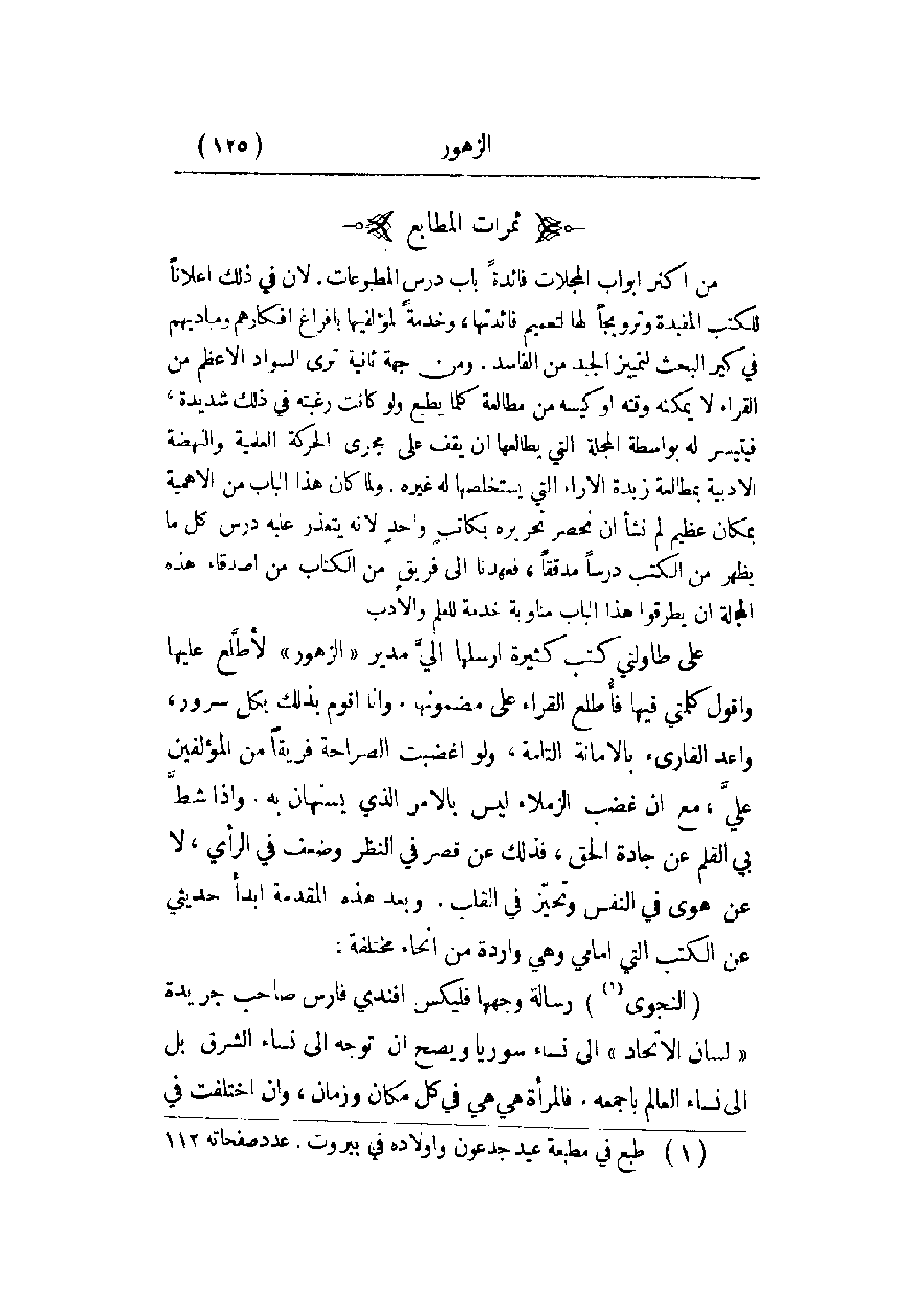 من أكثر أبواب المجلات فائدة باب درس المطبوعات. لأن في ذلك إعلاناً للكتب المفيدة وترويجاً لها لتعميم فائدتها، وخدمة لمؤلفيها بإفراغ أفكارهم ومبادئهم في كير البحث لتمييز الجيد من الفاسد. ومن جهة ثانية ترى السواد الأعظم من القراء لا يمكنه وقته أو كيسه من مطالعة كلما يطبع ولو كانت رغبته في ذلك شديدة، فيتيسر له بواسطة المجلة التي يطالعها أن يقف على مجرى الحركة العلمية والنهضة الأدبية بمطالعة زبدة الآراء التي يستخلصها له غيره. ولما كان هذا الباب من الأهمية بمكان عظيم لم نشأ أن نحصر تحريره بكاتب واحد لأنه يتعذر عليه درس كل ما يظهر من الكتب درساً مدققاً، فعهدنا إلى فريق من الكتاب من أصدقاء هذه المجلة أن يطرقوا هذا الباب مناوبة خدمة للعلم والأدب.
