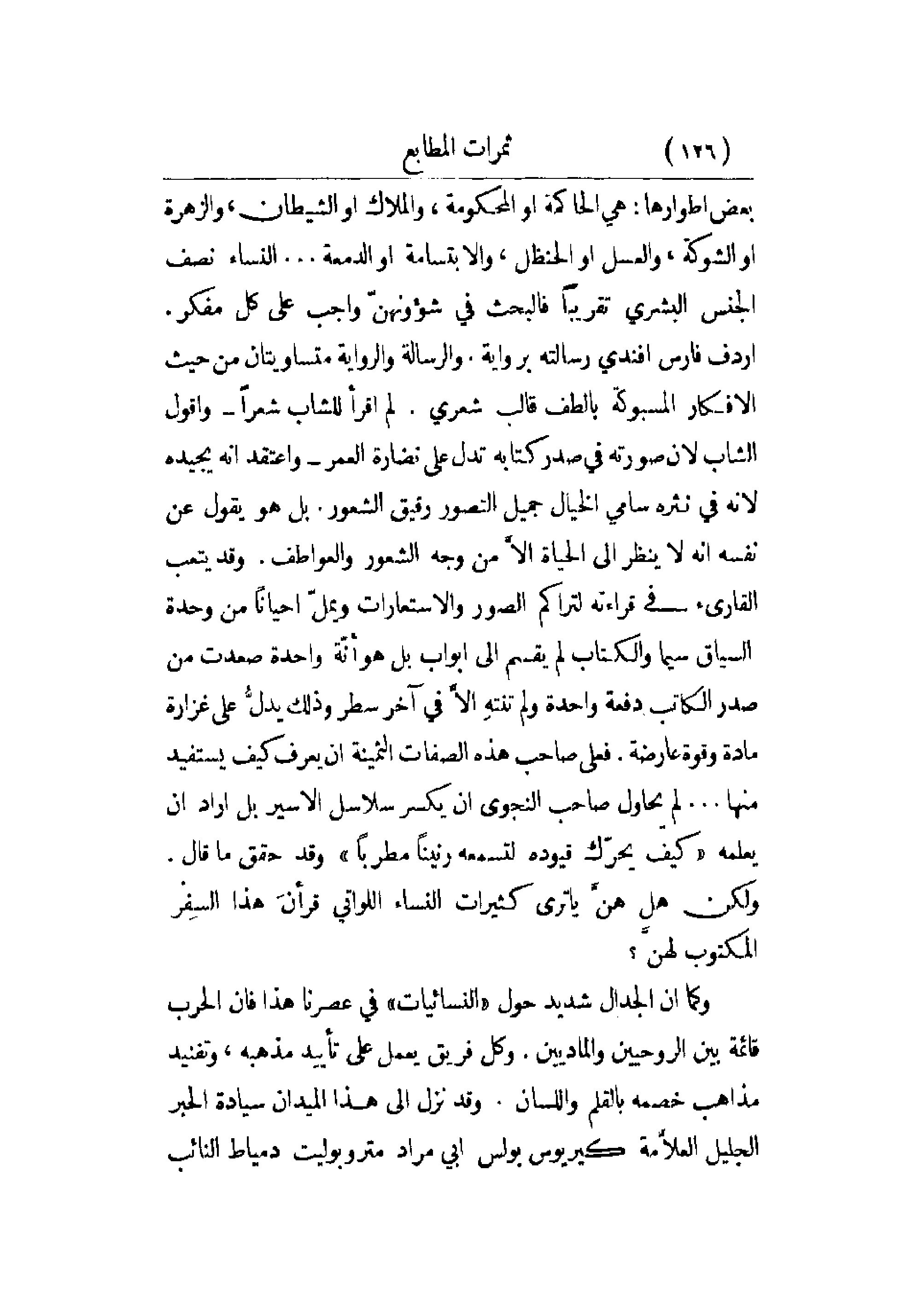 بعض أطوارها: هي الحاكمة أو المحكومة، والملاك أو الشيطان، والزهرة أو الشوكة، والعسل أو الحنظل، والابتسامة أو الدمعة. . . النساء نصف الجنس البشري تقريباً فالبحث في شؤونهن واجب على كل مفكر. أردف فارس أفندي رسالته برواية. والرسالة والرواية متساويتان من حيث الأفكار المسبوكة بألطف قالب شعري. لم أقرأ للشاب شعراً - وأقوال الشاب لأن صورته في صدر كتابه تدل على نضارة العمر - وأعتقد أنه يجيده لأنه في نثره سامي الخيال جميل التصور رقيق الشعور. بل هو يقول عن نفسه لأنه لا ينظر إلى الحياة إلا من وجه الشعور والعواطف. وقد يتعب القارئ في قراءاته لتراكم الصور والاستعارات ويمل أحياناً من وحدة السياق سيما والكتاب لم يقسم إلى أبواب بل هو أنة واحدة صعدت من صدر الكاتب دفعة واحدة ولم تته إلا في آخر