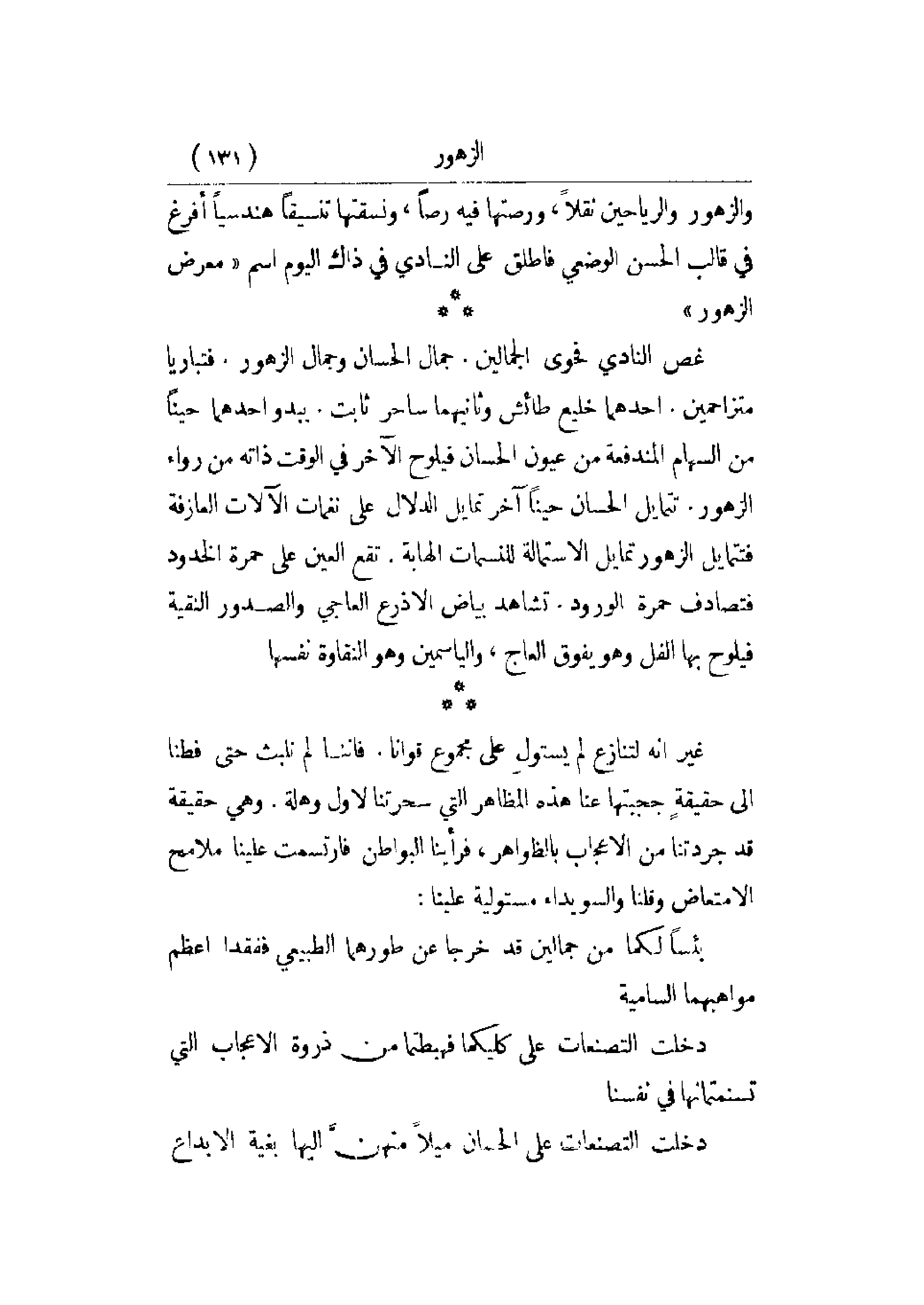 غص النادي فحوى الجمالين. جمال الحسان وجمال الزهور. فتباريا متزاحمين. أحدهما خليع طائش وثانيهما ساحر ثابت. يبدو أحدهما حيناً من السهام المندفعة من عيون الحسان فيلوح الآخر في الوقت ذاته من وراء الزهور. تتمايل الحسان حيناً آخر تمايل الدلال على نغمات الآلات العازفة فتتمايل الزهور تمايل الاستمالة للنسمات الهابة. تقع العين على حمرة الخدود فتصادف حمرة الورود. تشاهد بياض الأذرع العاجي والصدور النقية فيلوح بها الفل وهو يفوق العاج، والياسمين وهو النقاوة نفسها.