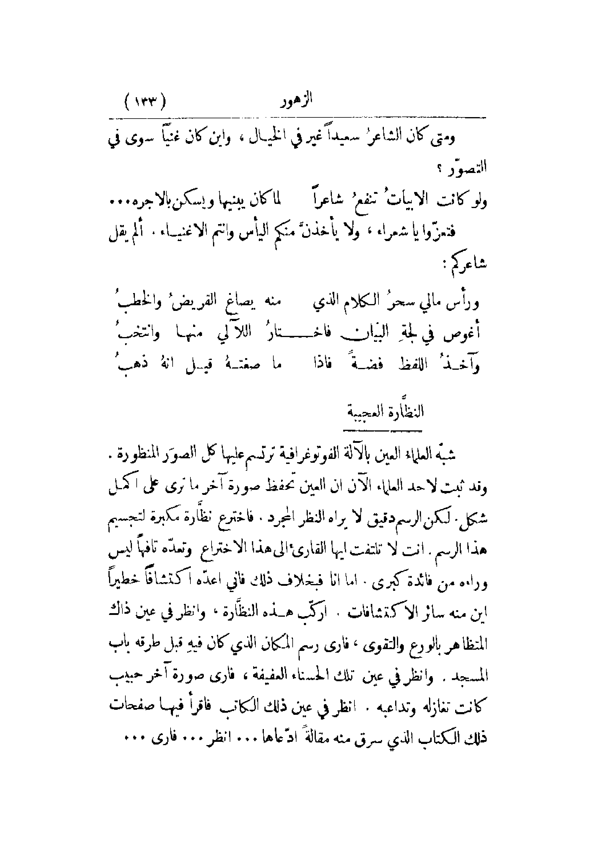 شبه العلماء العين بالآلة الفوتوغرافية ترتسم عليها كل الصور المنظورة. وقد ثبت لأحد العلماء الآن أن العين تحفظ صورة آخر ما ترى على أكمل شكل. لكن الرسم الدقيق لا يراه النظر المجرد. فاخترع نظارة مكبرة لتجسيم هذا الرسم. أنت لا تلتفت أيها القارئ إلى هذا الاختراع وتعده تافهاً ليس وراءه من فائدة كبرى. أما أنا فبخلاف ذلك فإني أعده اكتشافاً خطيراً أين منه سائر الاكتشافات. أركب هذه النظارة، وأنظر في عين ذاك المتظاهر بالورع والتقوى، فأرى رسم المكان الذي كان فيه قبل طرقه باب المسجد. وأنظر في عين تلك الحسناء العفيفة، فأرى صورة آخر حبيب كانت تغازله وتداعبه. انظر في عين الكاتب فأقرأ فيها صفحات ذلك الكتاب الذي سرق منه مقالة ادعاها. . . أنظر. . . فأرى. . .