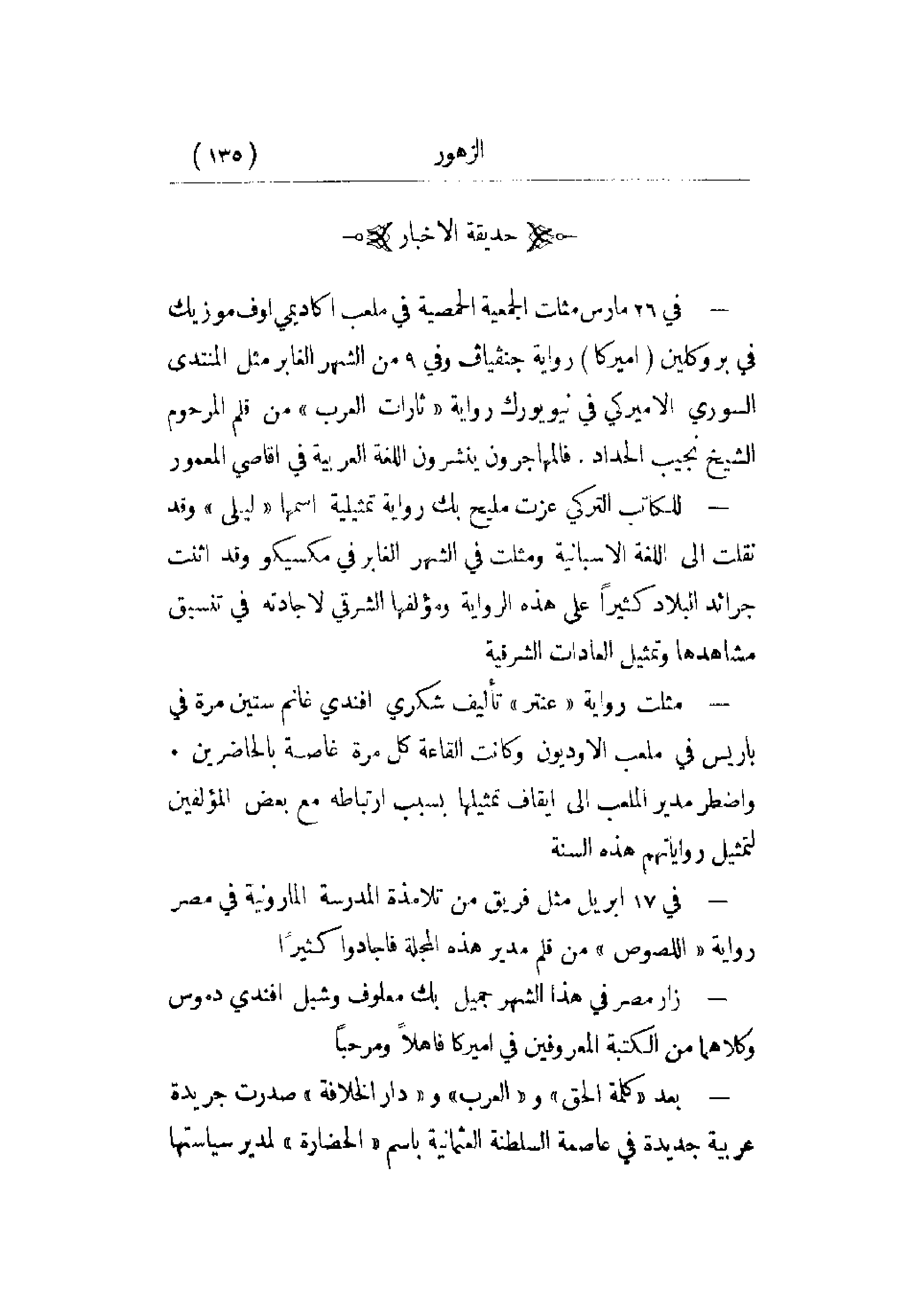 - زار مصر في هذا الشهر جميل بك معلوف وشبل أفندي دموس وكلاهما من الكتبة المعروفين في أمريكا فأهلاً ومرحباً.