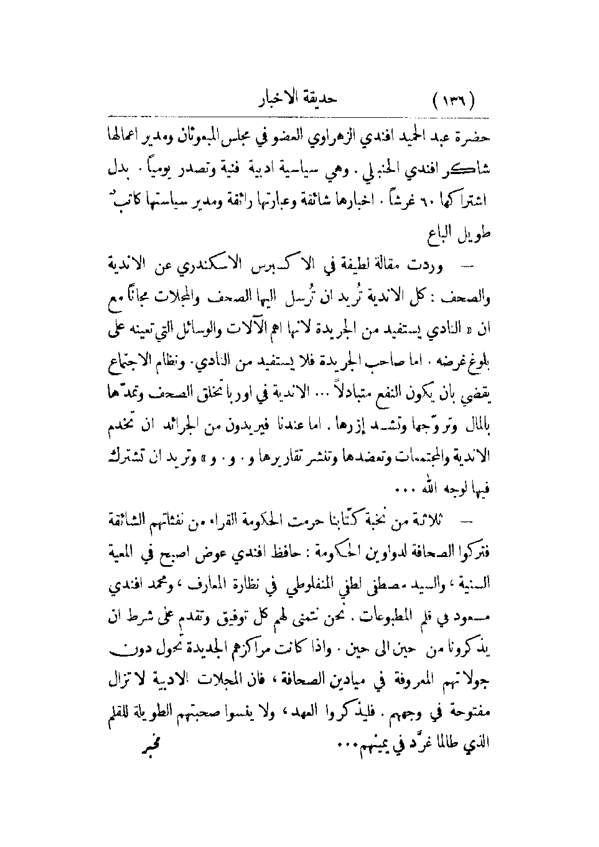 - وردت مقالة لطيفة في الإكسبرس الإسكندري عن الأندية والصحف: كل الأندية تريد أن ترسل إليها الصحف والمجلات مجاناً مع أن النادي يستفيد من الجريدة لأنها أهم الآلات والوسائل التي تعينه على بلوغ غرضه. أما صاحب الجريدة فلا يستفيد من النادي. ونظام الاجتماع يقضي بأن يكون النفع متبادلاً. . . الأندية في أوروبا تخلق الصحف وتمدها بالمال وتروجها وتشد إزرها. أما عندنا فيريدون من الجرائد أن تخدم الأندية والمجتمعات وتعضدها وتنشر تقاريرها و. و. و. وتريد أن تشترك فيها لوجه الله.