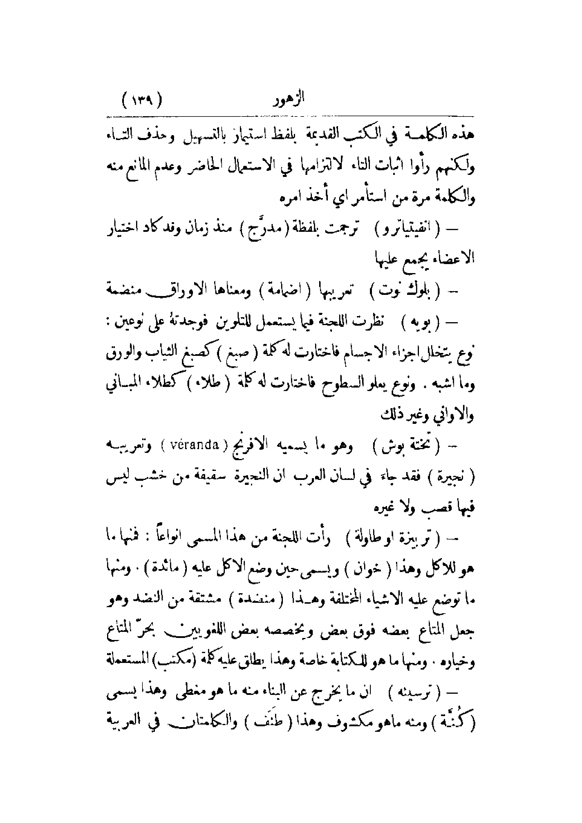 - (تختة بوش) وهو ما يسميه الإفرنج وتعريبه (نجيرة) فقد جاء في لسان العرب أن النجيرة سقيفة من خشب ليس فيها قصب ولا غيره.