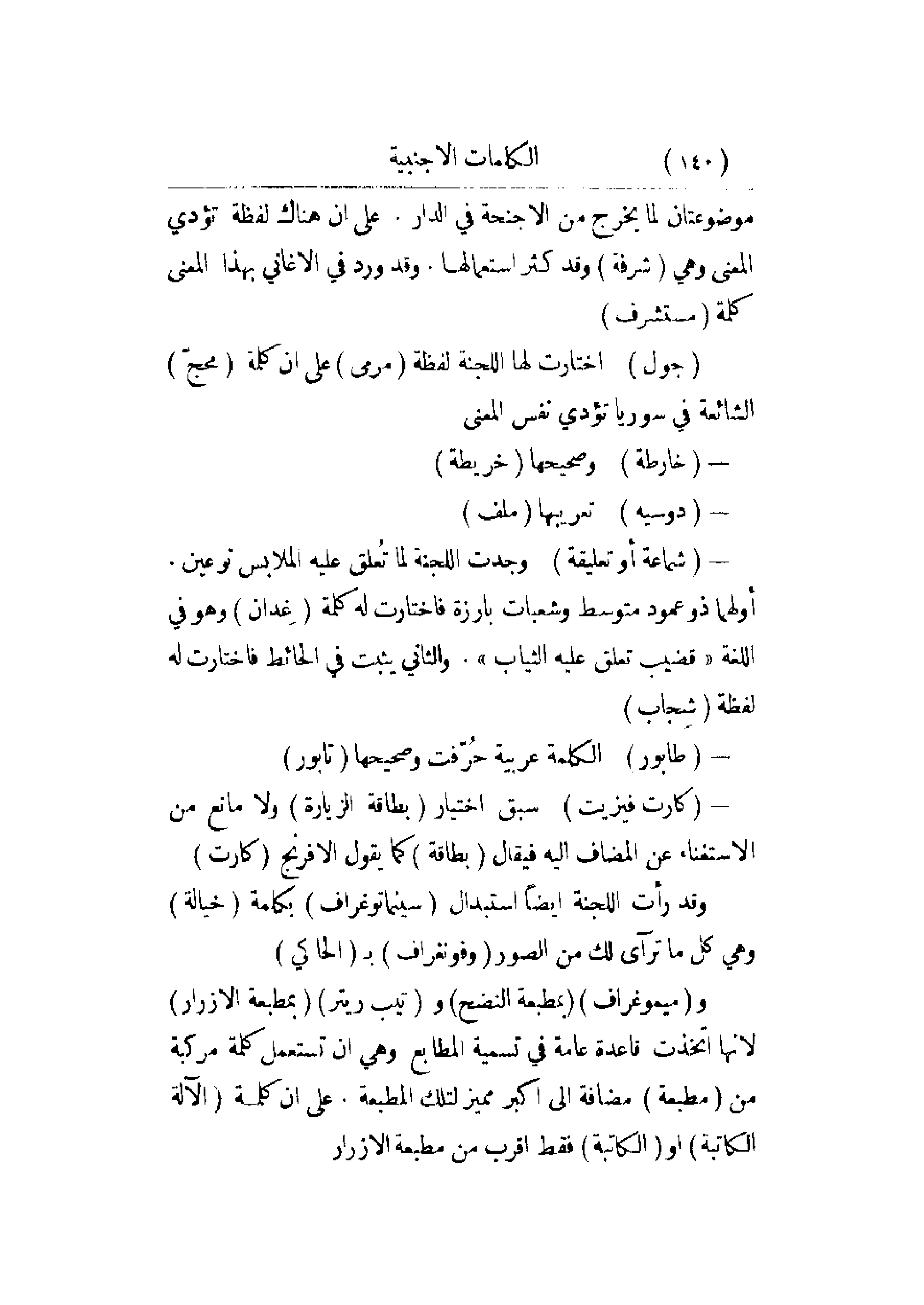 وقد رأت اللجنة أيضاً استبدال (سينماتوغراف) بكلمة (خيالة) وهي كل ما تراءى لك من الصور (وفونغراف) ب (الحاكي)