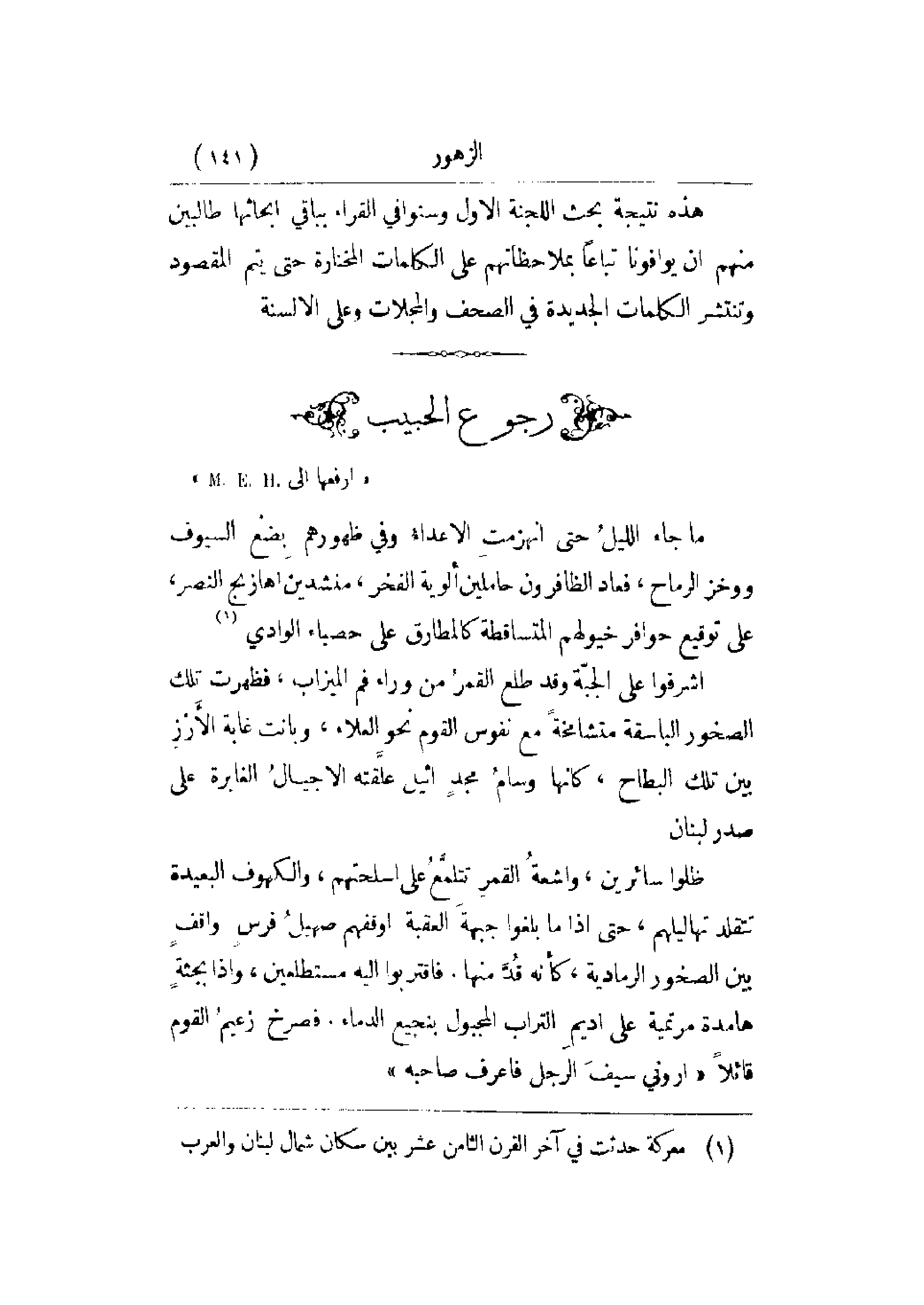 هذه نتيجة بحث اللجنة الأولى وسنوافي القراء بباقي أبحاثها طالبين منهم أن يوافونا تباعاً بملاحظاتهم على الكلمات المختارة حتى يتم المقصود وتنتشر الكلمات الجديدة في الصحف والمجلات وعلى الألسنة.