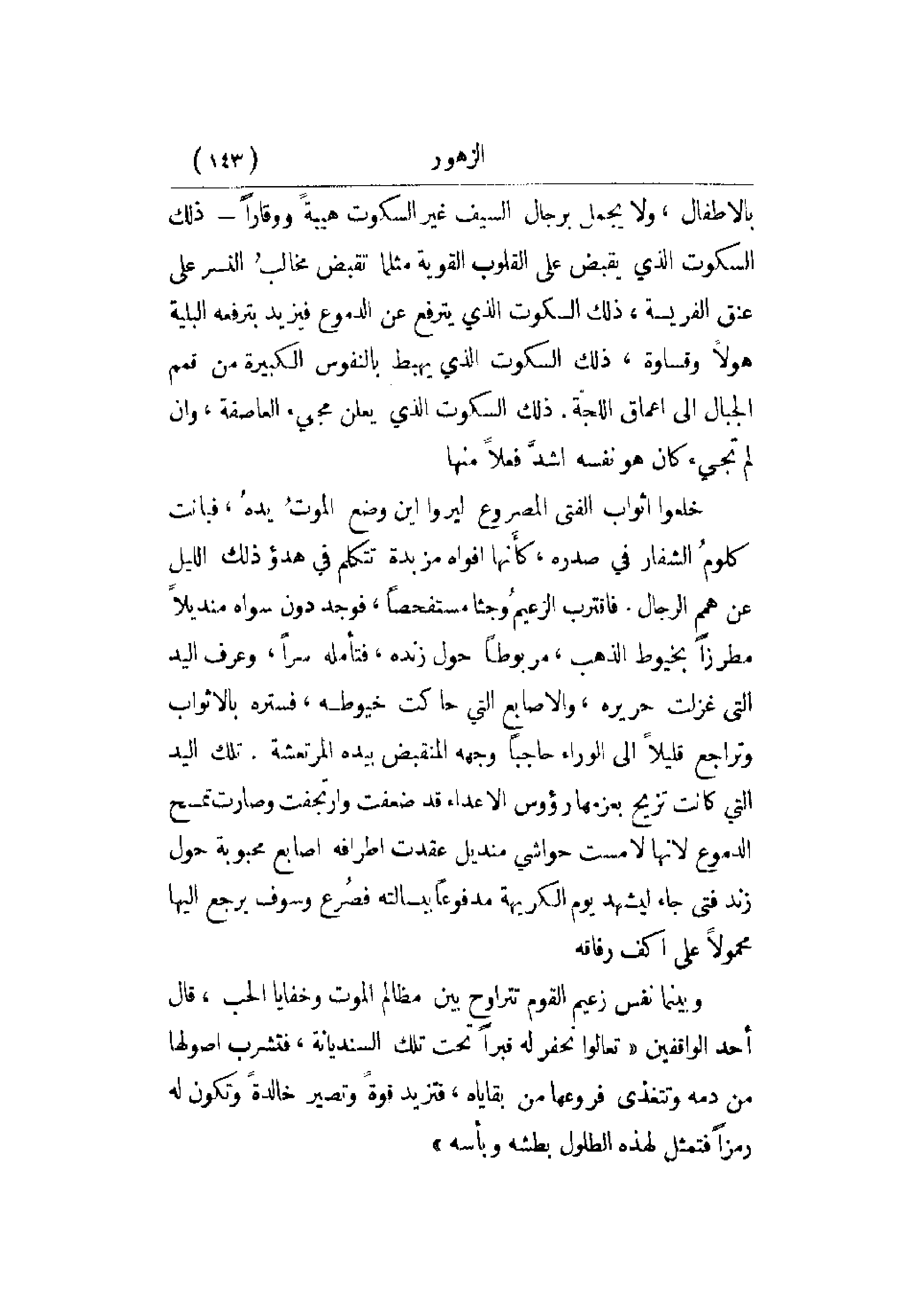 بالأطفال، ولا يجمل برجال السيف غير السكوت هيبة ووقاراً - ذلك السكوت الذي يقبض على القلوب القوية مثلما تقبض مخالب النسر على عنق الفريسة، ذلك السكوت الذي يرتفع عن الدموع فيزيد بترفعه البلية هولاً وقساوة، ذلك السكوت الذي يهبط بالنفوس الكبيرة من قمم الجبال إلى أعماق اللجة. ذلك السكوت الذي يعلن مجيء العاصفة، وأن لم تجيء كان هو نفسه أشد فعلاً منها.