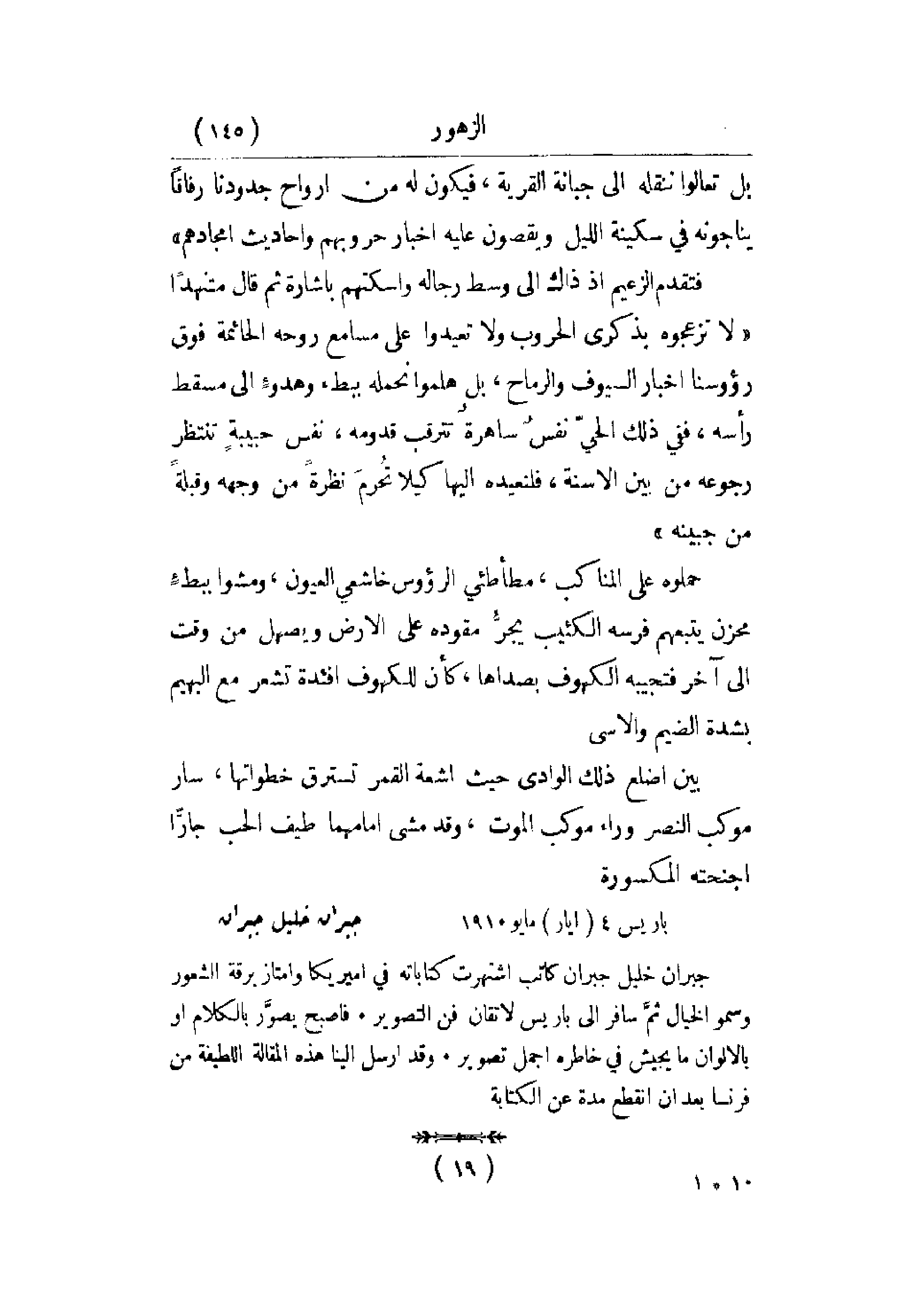 فتقدم الزعيم إذ ذاك إلى وسط رجاله وأسكتهم بإشارة ثم قال متنهداً: لا تزعجوه بذكرى الحروب ولا تعيدوا على مسامع روحه الحائمة فوق رؤوسنا أخبار السيوف والرماح، بل هلموا نحمله ببطء وهدوء إلى مسقط رأسه، ففي ذلك الحي نفس ساهرة تترقب قدومه، نفس حبيبة تنتظر رجوعه من بين الأسنة، فلنعيده إليها كيلا تحرم نظرة من وجهه وقبلة من جبينه.