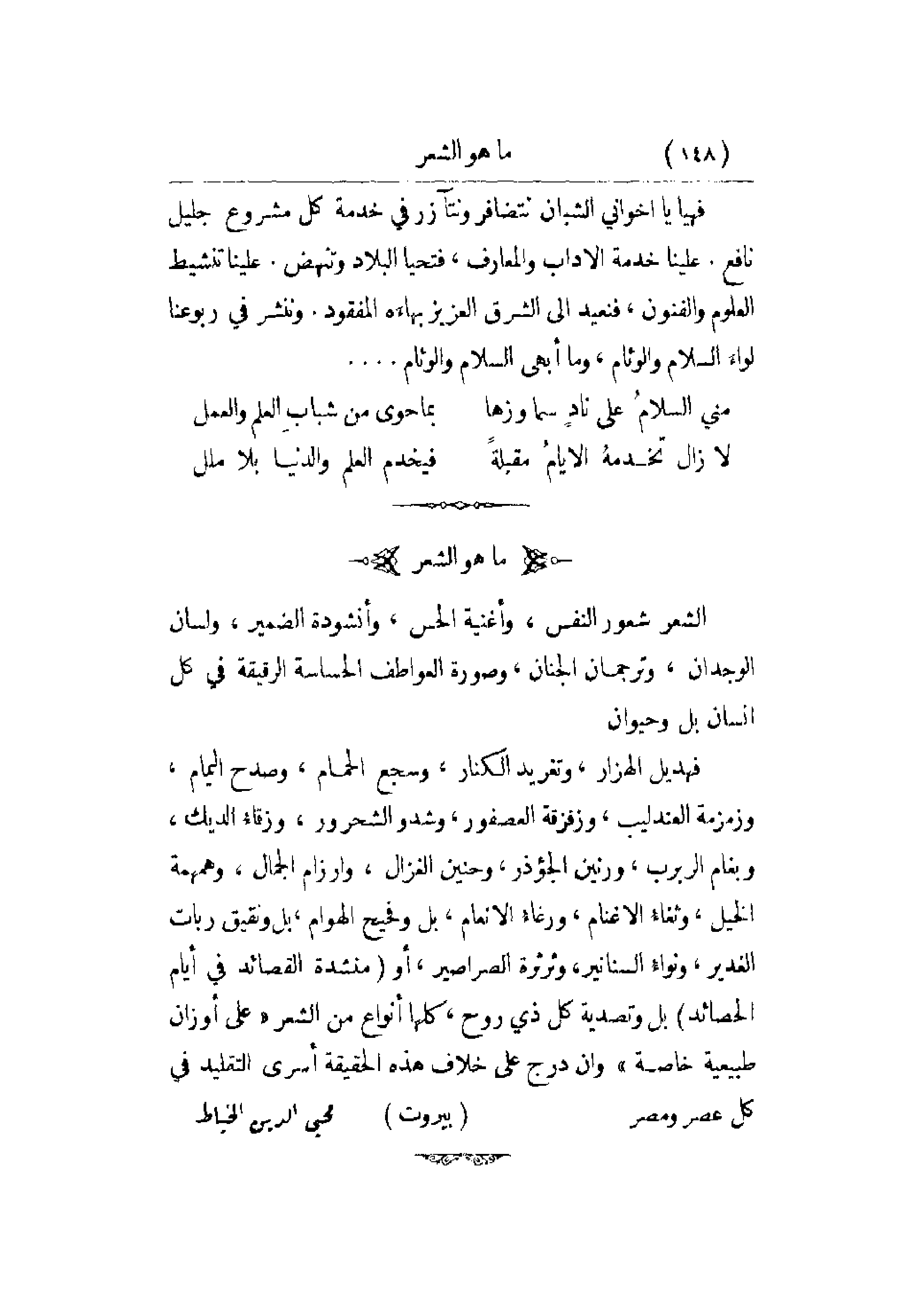 فهيا يا أخوتي الشبان نتضافر ونتآزر في خدمة كل مشروع جليل نافع. علينا خدمة الآداب والمعارف، فتحيا البلاد وتنهض. علينا تنشيط العلوم والفنون، فنعيد إلى الشرق العزيز بهاءه المفقود. وننشر في ربوعنا لواء السلام والوئام، وما أبهى السلام والوئام. . . .