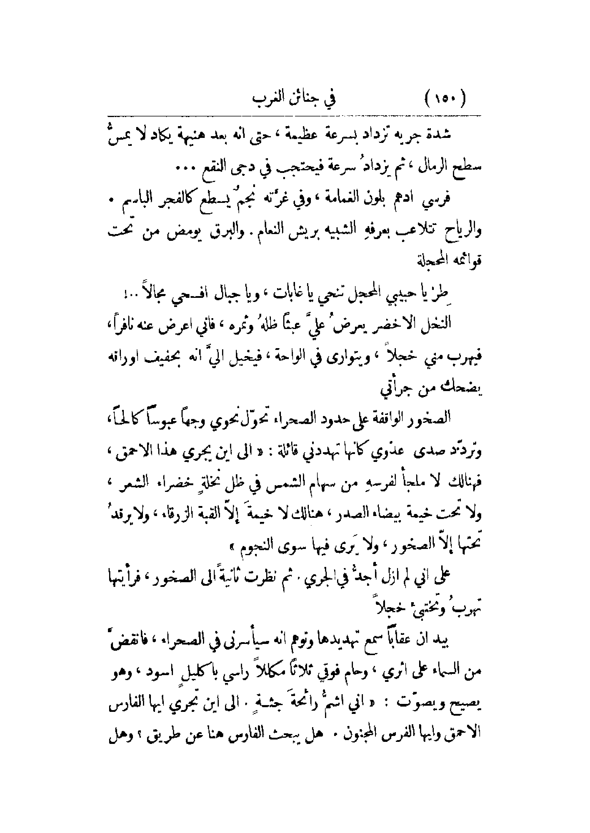 شدة جريه تزداد بسرعة عظيمة، حتى أنه بعد هنيهة يكاد لا يمس سطح الرمال، ثم يزداد سرعة فيحتجب في دجى النقع. . .