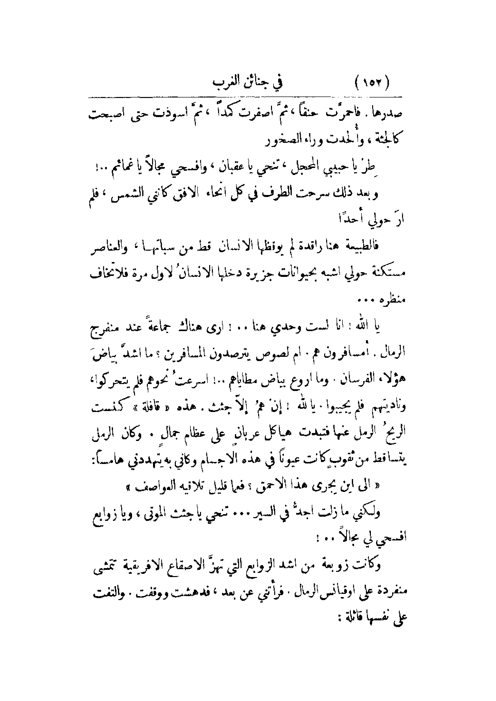يا الله! أنا لست وحدي هنا. .! أرى هناك جماعة عند منفرج الرمال. أمسافرون هم. أم لصوص يترصدون المسافرين؟ ما أشد بياض هؤلاء الفرسان. وما أروع بياض مطاياهم. .! أسرعت نحوهم فلم يتحركوا، وناديتهم فلم يجيبوا. يا الله! إن هم إلا جثث. هذه قافلة كنست الريح الرمل عنها فتبدت هياكل عربان على عظام جمال. وكان الرمل يتساقط من ثقوب كانت عيوناً في هذه الأجسام وكأني به يتهددني هامساً: