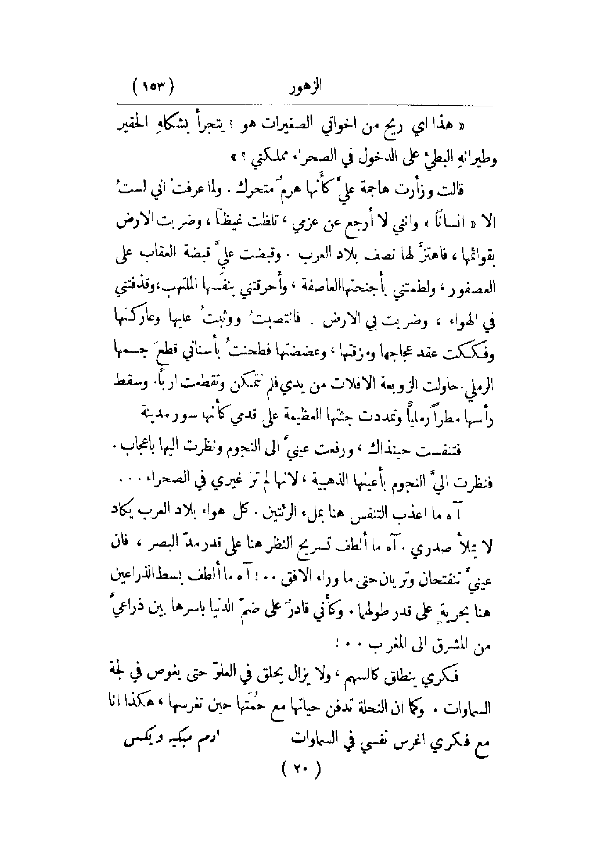 قالت وزأرت هاجمة علي كأنها هرم متحرك. ولما عرفت أني لست إلا إنساناً وأنني لا أرجع عن عزمي، تلظت غيظاً، وضرب الأرض بقوائمها، فاهتز لها نصف بلاد العرب. وفبضت علي قبضة العقاب على العصفور، ولطمتني بأجنحتها العاصفة، وأحرقتني بنفسها الملتهب، وقذفتني في الهواء، وضربت بي الأرض. فانتصبت ووثبت عليها وعاركتها وفككت عقد عجاجها ومزقتها، وعضضتها فطحنت بأسناني قطع جسمها الرملي. حاولت الزوبعة الإفلات من يدي فلم تتمكن وتقطعت إرباً. وسقط رأسها مطراً رملياً وتمددت جثتها العظيمة على قدمي كأنها سور مدينة.