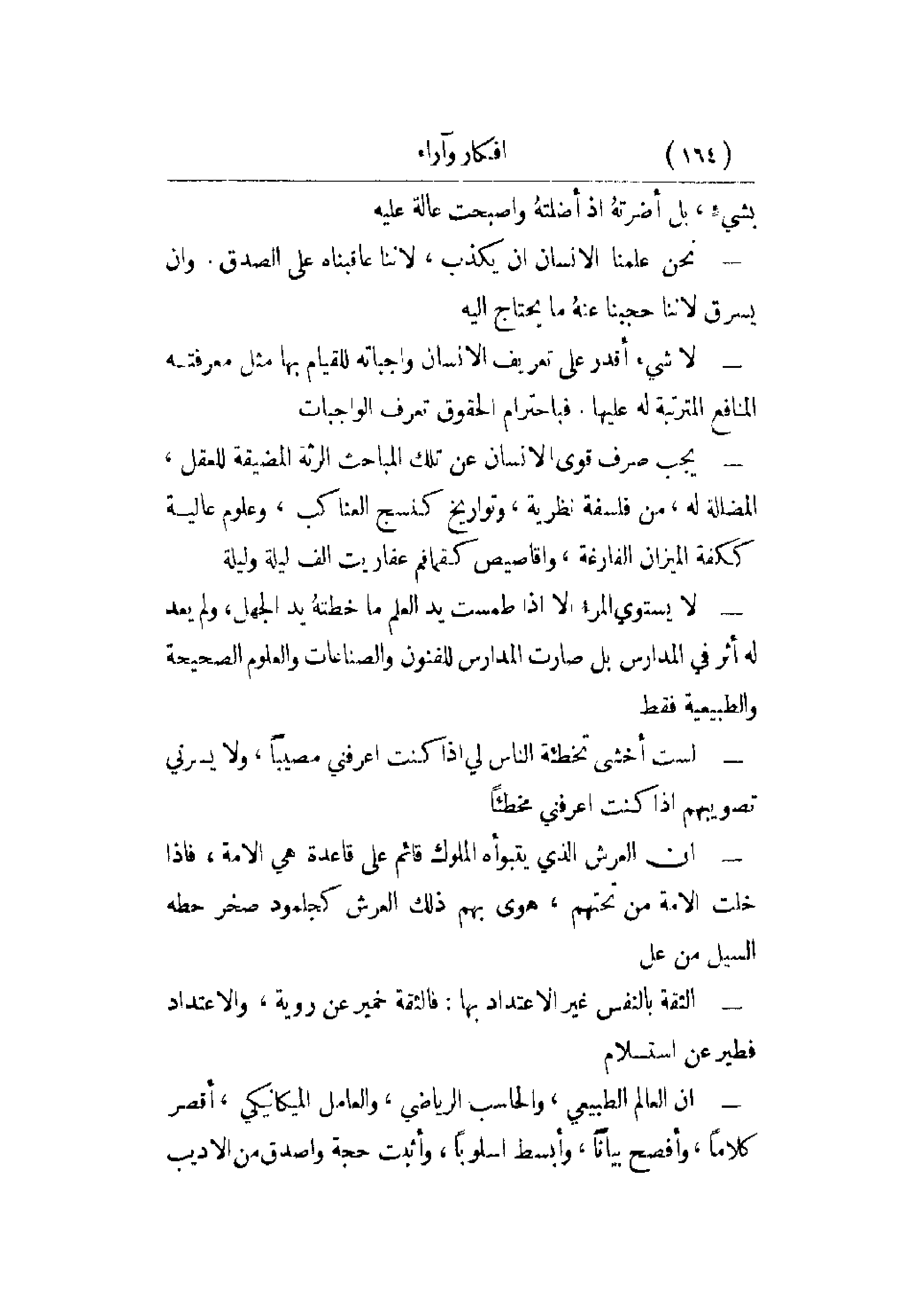 - لا يستوي المرء إلا إذا طمست يد العلم ما خطته يد الجهل، ولم يعد له أثر في المدارس بل صارت المدارس للفنون والصناعات والعلوم الصحيحة والطبيعية فقط.