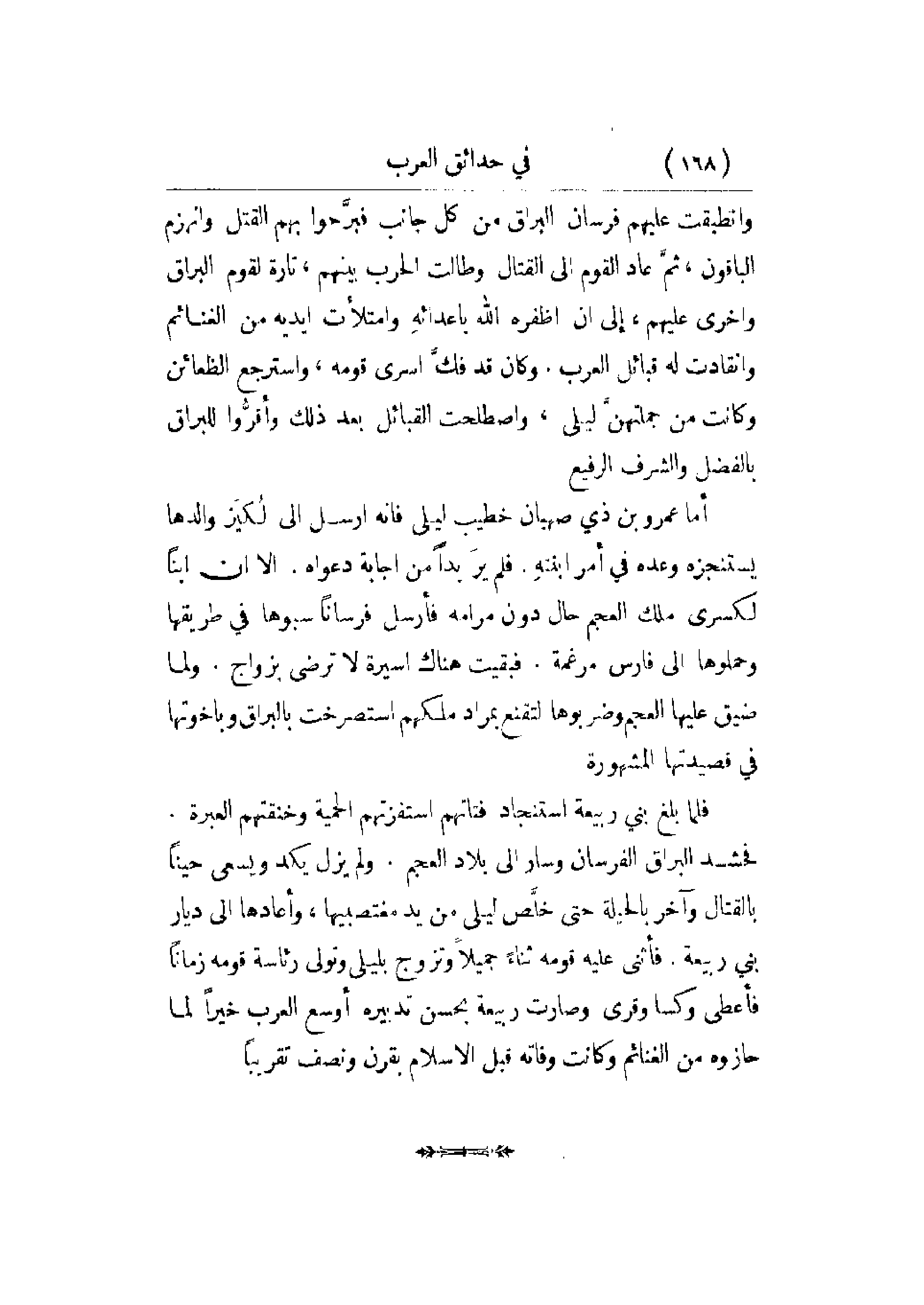 وانطبقت عليهم الفرسان البراق من كل جانب فبرّحوا بهم القتل وانهزم الباقون، ثم عاد القوم إلى القتال وطالت الحرب بينهم، تارة لقوم البراق وأخرى عليهم، إلى أن أظفره الله بأعدائه وامتلأت أيديه من الغنائم وانقادت له قبائل العرب. وكان قد فك أسرى قومه، واسترجع الظعائن وكانت من جملتهن ليلى، واصطلحت القبائل بعد ذلك وأقروا للبراق بالفضل والشرف الرفيع.