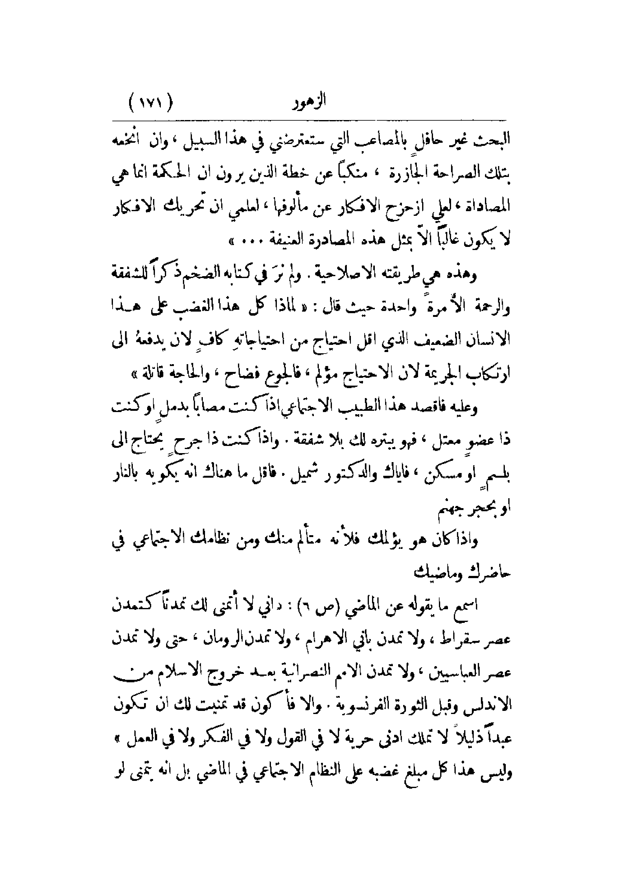 البحث غير حافل بالمصاعب التي ستعترضني في هذا السبيل، وأن انخعه بتلك الصراحة الجازرة، منكباً عن خطة الذين يرون أن الحكمة إنما هي المصاداة، لعلي أزحزح الأفكار عن مألوفها، لعلمي أن تحريك الأفكار لا يكون غالباً إلا بمثل هذه المصادرة العنيفة. . .
