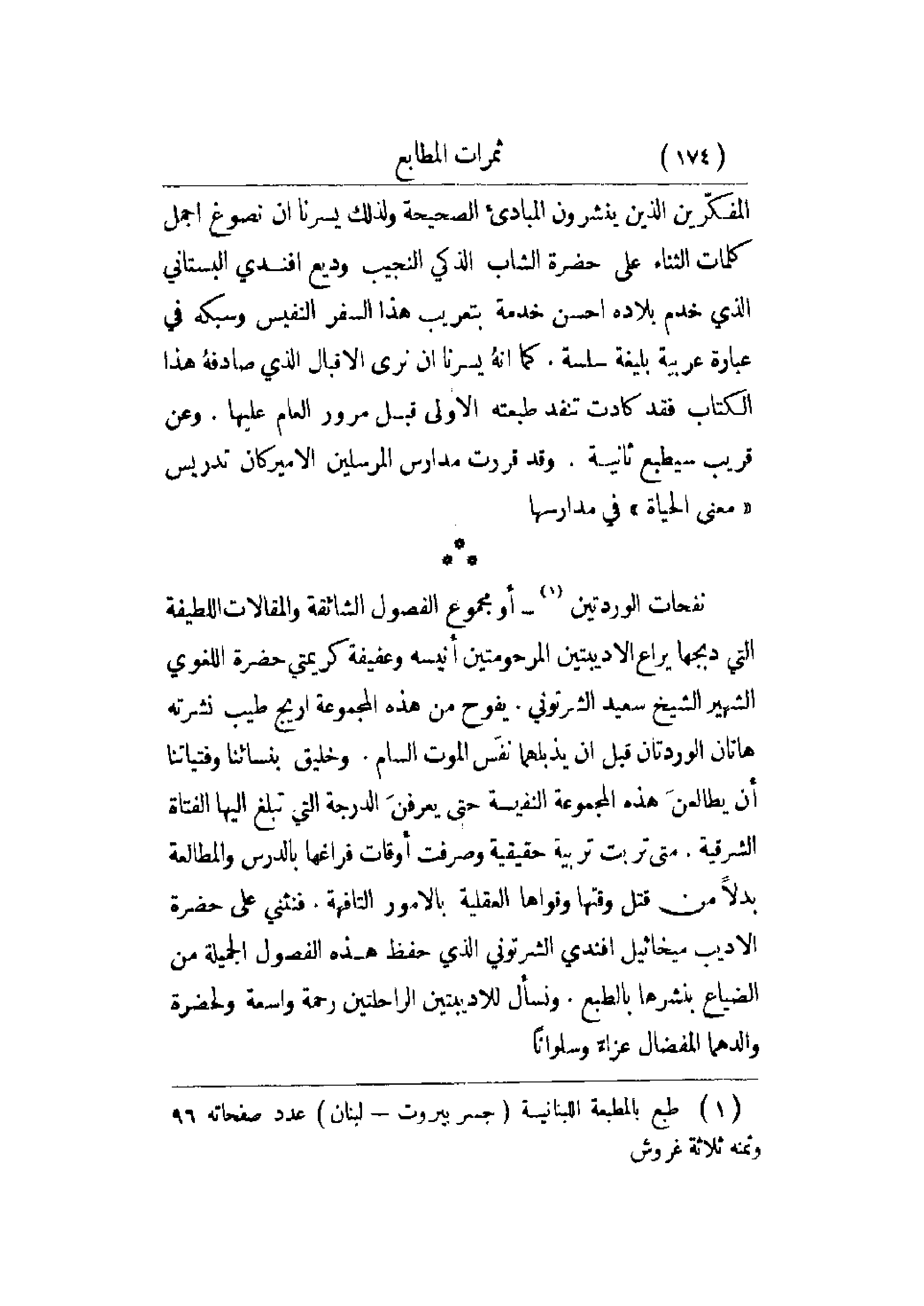 نفحات الوردتين - أو مجموع الفصول الشائقة والمقالات اللطيفة التي دبجها يراع الأديبتين المرحومتين أنيسة وعفيفة كريمتي حضرة اللغوي الشهير الشيخ سعيد الشرتوني. يفوح من هذه المجموعة أريح طيب نشرته هاتان الوردتان قبل أن يذبلهما نفس الموت السام. وخليق بنسائنا وفتياتنا أن يطالعن هذه المجموعة النفيسة حتى يعرفن الدرجة التي تبلغ إليها الفتاة الشرقية. متى ترتب تربية حقيقة وصرفت أوقات فراغها بالدرس والمطالعة بدلاً من قتل وقتها وقواها العقلية بالأمور التافهة. فنثني على حضرة الأديب ميخائيل أفندي الشرتوني الذي حفظ هذه الفصول الجميلة من الضياع بنشرها بالطبع. ونسأل للأديبتين الراحلتين رحمة واسعة ولحضرة والدهما المفضال عزاء وسلواناً.