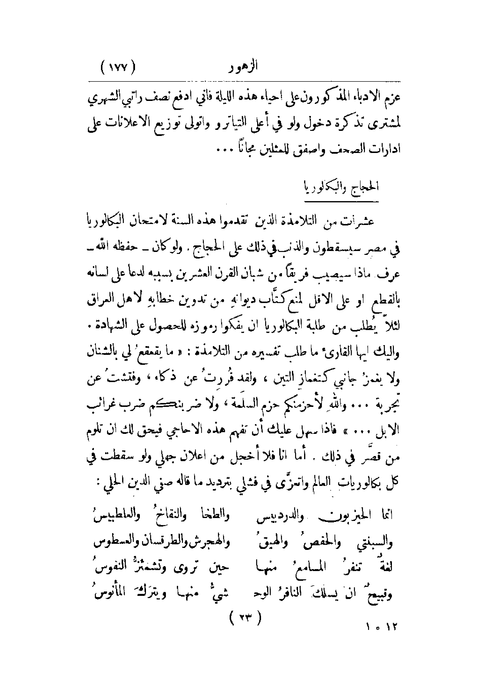 عشرات ن التلامذة الذين تقدموا هذه السنة لامتحان البكالوريا في مصر سيسقطون والذنب في ذلك على الحجاج ولو كان - حفظه الله - عرف ماذا سيصيب فريقاً من شباب القرن العشرين بسببه لدعا على لسانه بالقطع أو على الأقل لمنع كتّاب ديوانه من تدوين خطابه لأهل العراق لئلا يطلب من طلبة البكالوريا أن يفكوا رموزه للحصول على الشهادة. وإليك أيها القارئ ما طلب تفسيره من التلامذة: ما يقعقع لي بالشنان ويغمز جانبي كتغماز التين، ولقد فررت عن ذكاء، وفتشت عن تجربة. . . والله لأحزمنكم حزم السلمة، ولأضربنكم ضرب غرائب الإبل. . . فإذا سهل عليك أن تفهم هذه الأحاجي فيحق لك أن تلوم من قصر في ذلك. اما انا فلا أخجل من إعلان جهلي ولو سقطت في كل بكالوريات العالم وأتعزى في فشلي بترديد ما قاله صفي الدين الحلي: