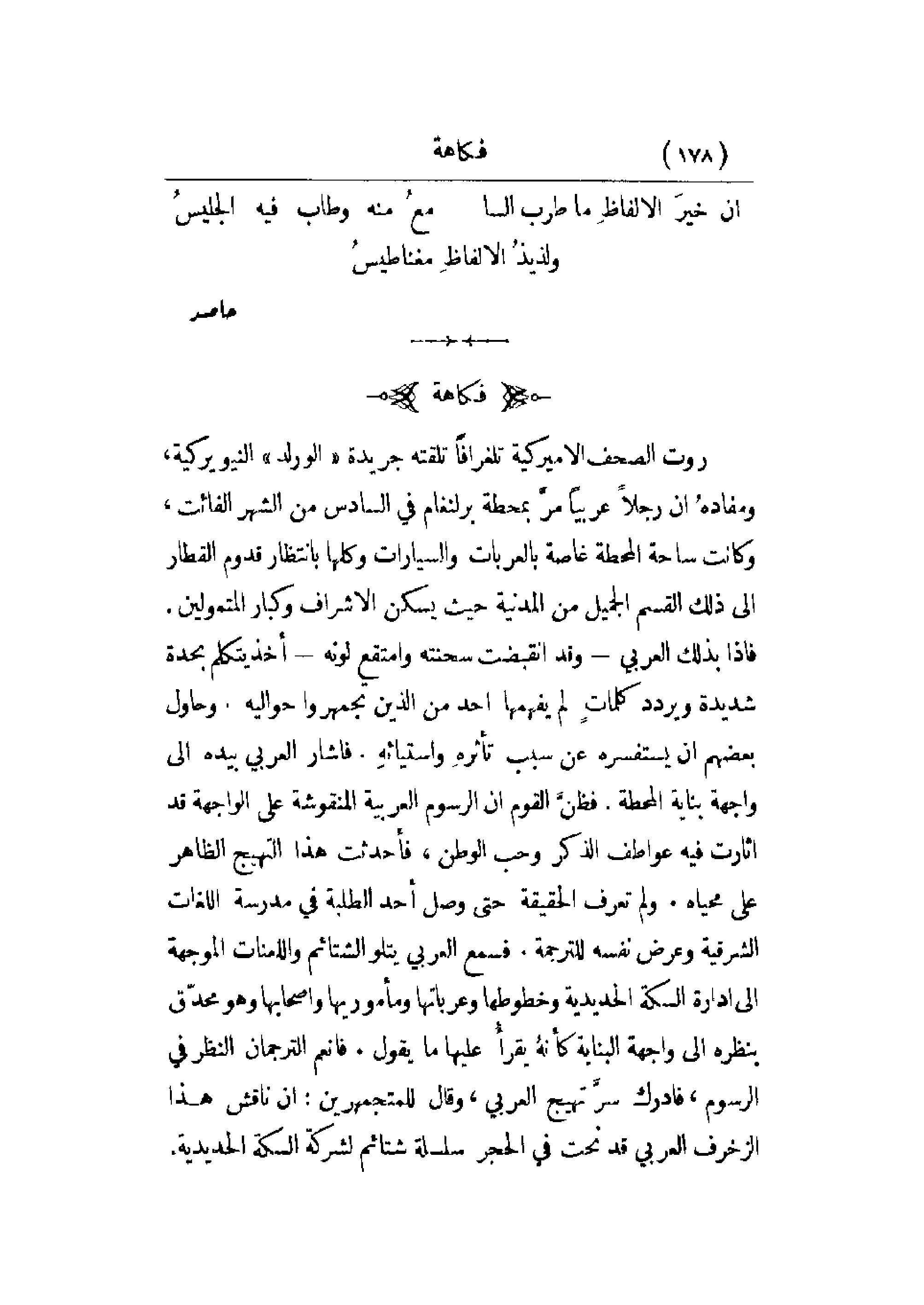 روت الصحف الأمريكية تلغرافاً تلقته جريدة الورلد النيويوركية، ومفاده أن رجلاً عربياً مر بمحطة برلنغام في السادس من الشهر الفائت، وكانت ساحة المحطة غاصة بالعربات والسيارات وكلها بانتظار قدوم القطار إلى ذلك القسم الجميل من المدينة حيث يسكن الأشراف وكبار المتمولين. فإذا بذلك العربي - وقد انقبضت سحنته وامتقع لونه - أخذ يتكلم بحدة شديدة ويردد كلمات لم يفهمها أحد من الذين تجمهروا حواليه. وحاول بعضهم أن يستفسره عن سبب تأثره واستيائه. فأشار العربي بيده إلى واجهة بناية المحطة. فظن القوم أن الرسوم العربية المنقوشة على الواجهة قد أثارت فيه عواطف الذكر وحب الوطن، فأحدثت هذا التهيج الظاهر على محياه. ولم تعرف الحقيقة حتى وصل أحد الطلبة في مدرسة اللغات الشرقية وعرض نفسه للترجمة. فسمع العربي يتلو الشتائم واللعانات الموجهة إلى إدارة السكة الحديدية وخطوطها وعرباتها ومأموريها وأصحابها وهو محدق بنظره إلى واجهة البناية كأنه يقرأ عليها ما يقول. فأنعم الترجمان النظر في الرسوم، فأدرك سر تهيج العربي، وقال للمتجمهرين: إن ناقش هذا الزخرف العربي قد نحت في الحجر سلسلة شتائم لشركة السكة الحديدية.