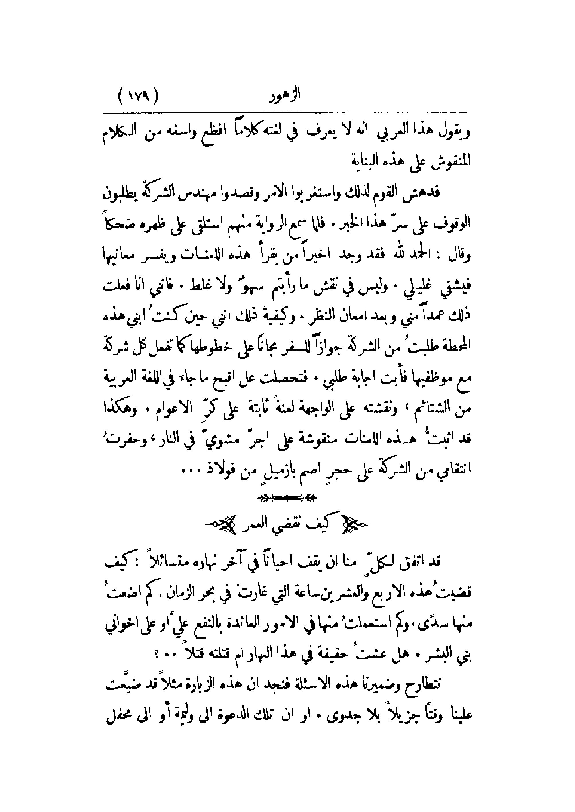 قد اتفق لكل منا أن يقف أحياناً في آخر نهاره متسائلاً: كيف قضيت هذه الأربع والعشرين ساعة التي غارت في بحر الزمان. كم أضعت منها سدة. وكم استعملت منها في الأمور العائدة بالنفع علي أو على إخواني بني البشر. هل عشت حقيقة في هذا النهار أم قتلته قتلاً. . .؟