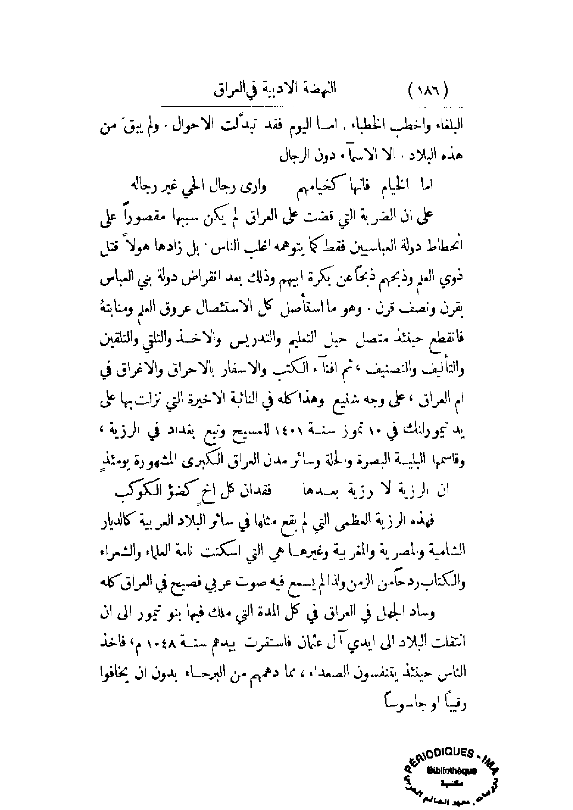 على أن الضربة التي قضت على العراق لم يكن سببها مقصوراً على انحطاط دولة العباسيين فقط كما يتوهمه أغلب الناس. بل زادها هولاً قتل ذوي العلم وذبحهم ذبحاً عن بكرة أبيهم وذلك بعد انقراض دولة بني العباس بقرن ونصف قرن. وهو ما استأصل كل الاستئصال عروق العلم ومنابته فانقطع حينئذ متصل حبل التعليم والتدريس والأخذ والتلقي والتلقين والتأليف والتصنيف، ثم إفناء الكتب والأسفار بالإحراق والإغراق في أم العراق، على وجه شنيع وهذا كله في النائبة الأخيرة التي نزلت بها على يد تيمورلنك في 10 تموز سنة 1401 للمسيح وتبع بغداد في الرزية، وقاسمها البلية البصرة والحلة وسائر مدن العراق الكبرى المشهورة يومئذ.