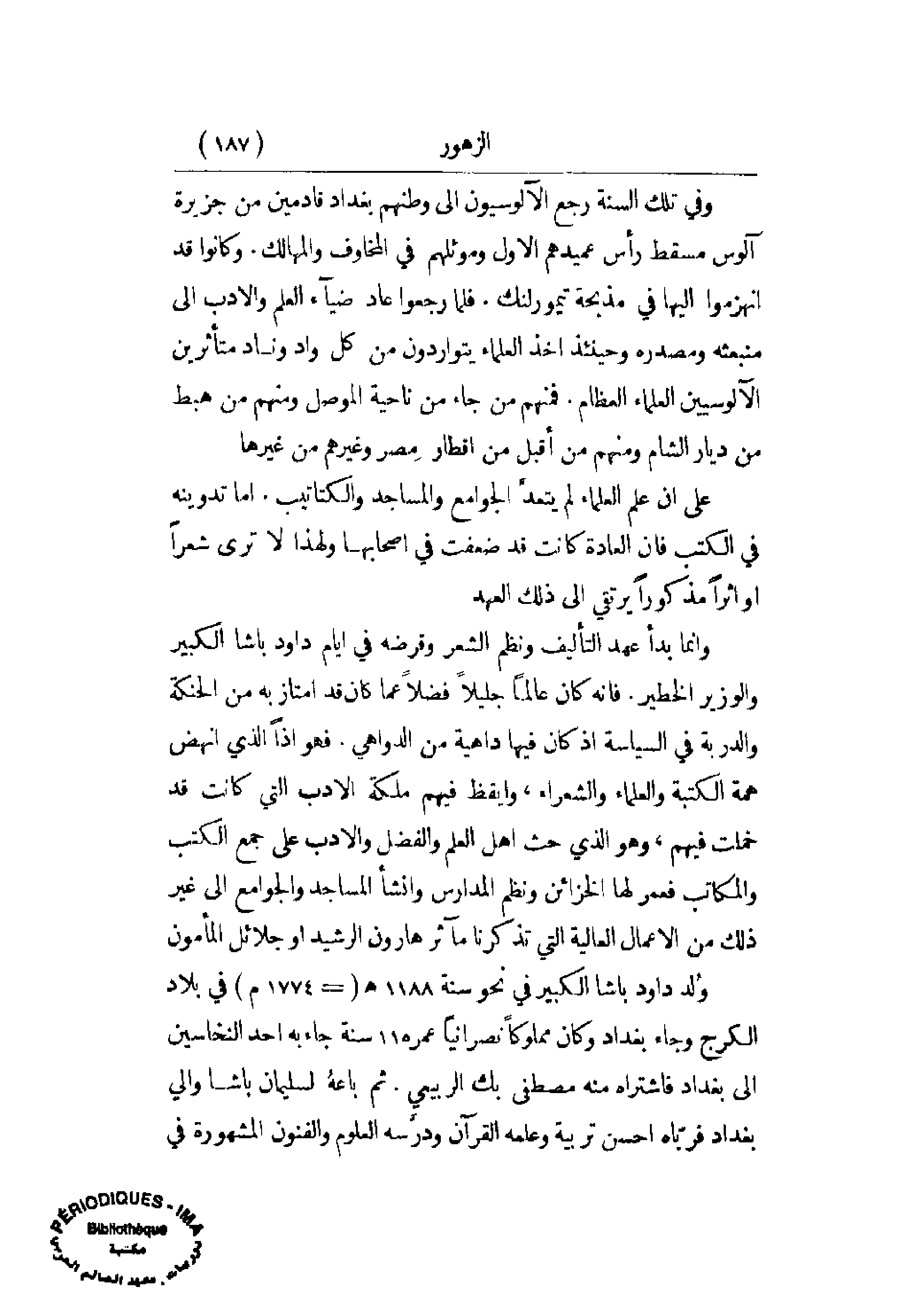وإنما بدأ عهد التأليف ونظم الشعر وقرضه في أيام داود باشا الكبير والوزير الخطير. فإنه كان عالماً جليلاً فضلاً عما كان قد امتاز به من الحنكة والدربة في السياسة إذ كان فيها داهية من الدواهي. فهو إذاً الذي أنهض همة الكتبة والعلماء والشعراء، وأيقظ فيهم ملكة الأدب التي كانت قد خملت فيهم، وهو الذي حث أهل العلم والفضل والأدب على جمع الكتب والمكاتب فعمر لها الخزائن ونظم المدارس وأنشأ المساجد والجوامع إلى غير ذلك من الأعمال العالية التي تذكرنا مآثر هارون الرشيد أو جلائل المأمون.