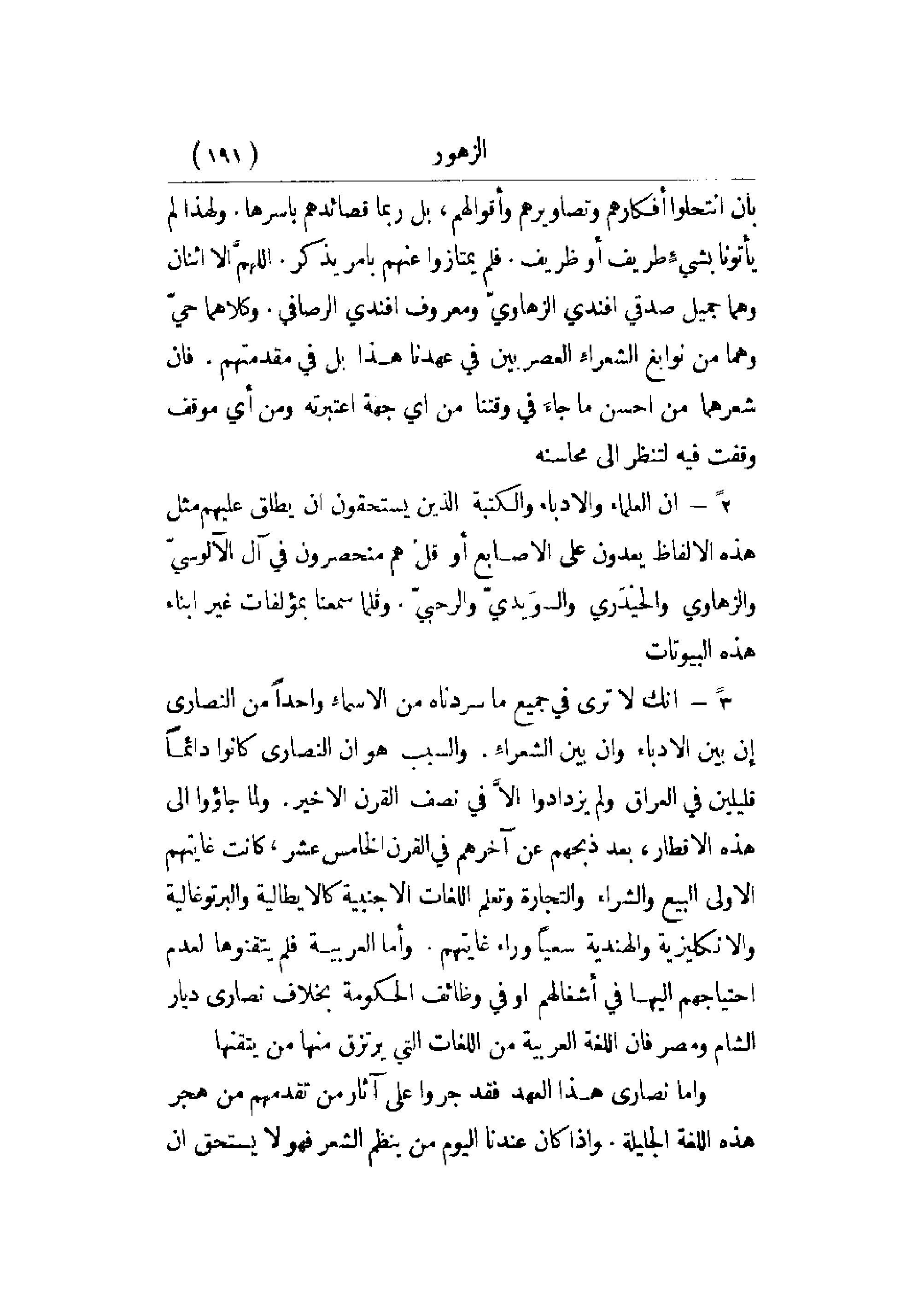 3 - إن لا ترى في جميع ما سردناه من الأسماء واحداً من النصارى إن بين الأدباء وإن بين الشعراء. والسبب هو أن النصارى كانوا دائماً قليلين في العراق ولم يزدادوا إلا في نصف القرن الأخير. ولما جاؤوا إلى هذه الأقطار، بعد ذبحهم عن آخرهم في القرن الخامس عشر، كانت غايتهم الأولى البيع والشراء والتجارة وتعلم اللغات الأجنبية كالإيطالية والبرتغالية والإنكليزية والهندية سعياً وراء غايتهم. وأما العربية فلم يتقنوها لعدم احتياجهم إليها في أشغالهم أو في وظائفهم الحكومية بخلاف نصارى ديار الشام ومصر فإن اللغة العربية من اللغات التي يرتزق منها من يتقنها.