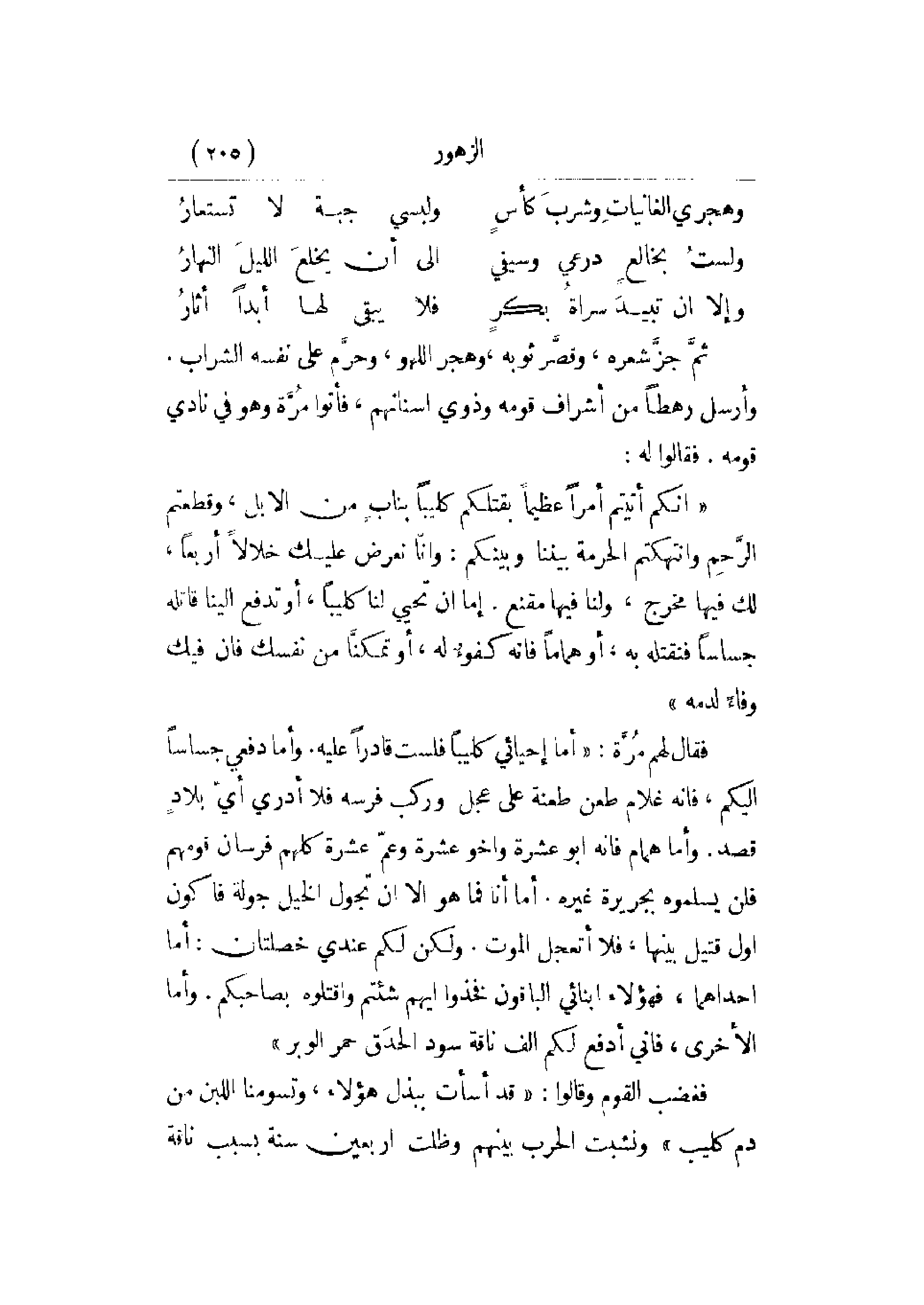 فغضب القوم وقالوا: قد أسأت ببذل هؤلاء، وتسومنا اللبن من دم كليب. ونشبت الحرب بينهم ولت أربعين سنة بسبب ناقة