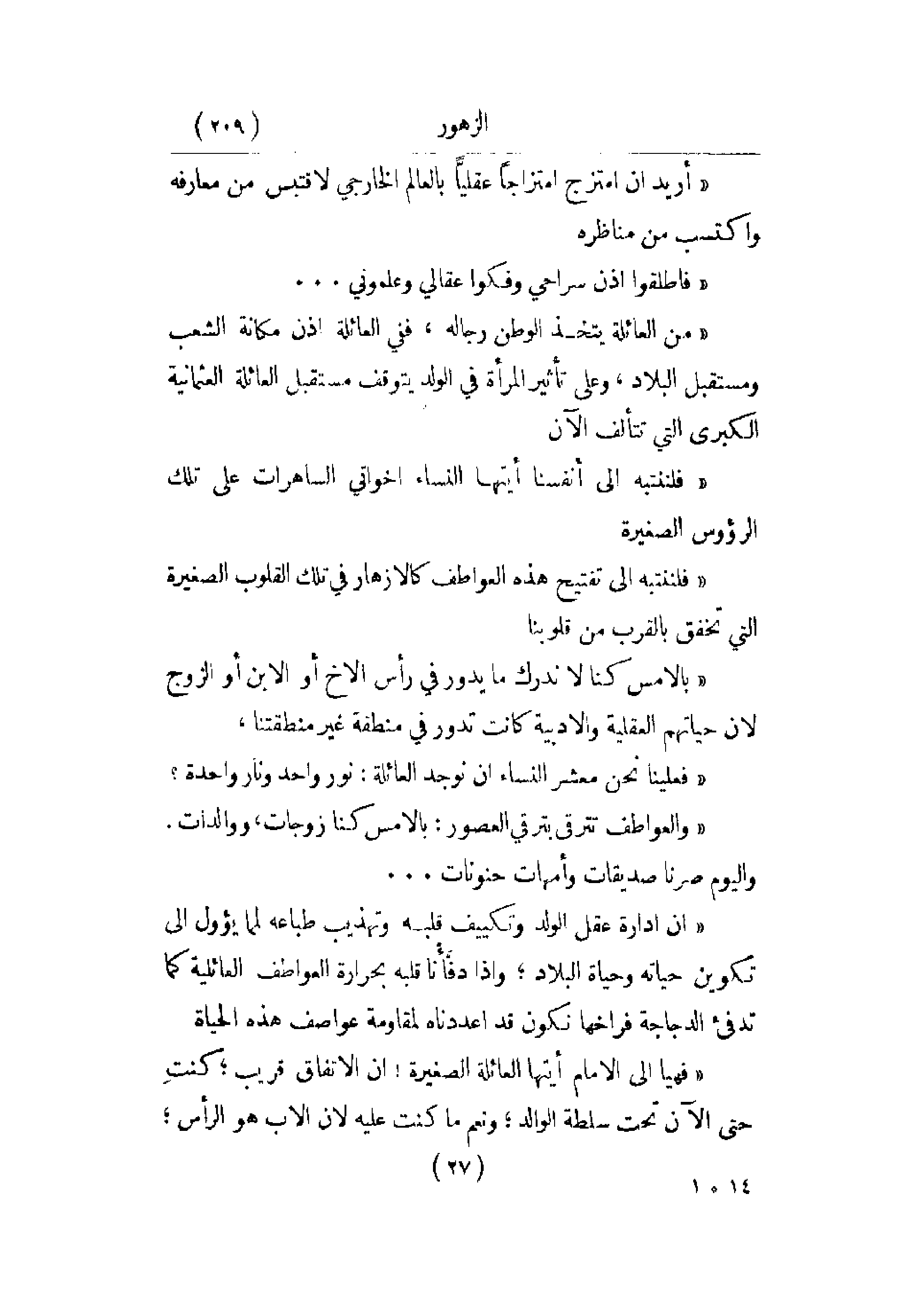 من العائلة يتخذ الوطن رجاله، ففي العائلة إذن مكانه العشب ومستقبل البلاد، وعلى تأثير المرأة في الود يتوقف مستقبل العائلة العثمانية الكبرى التي تتألف الآن.