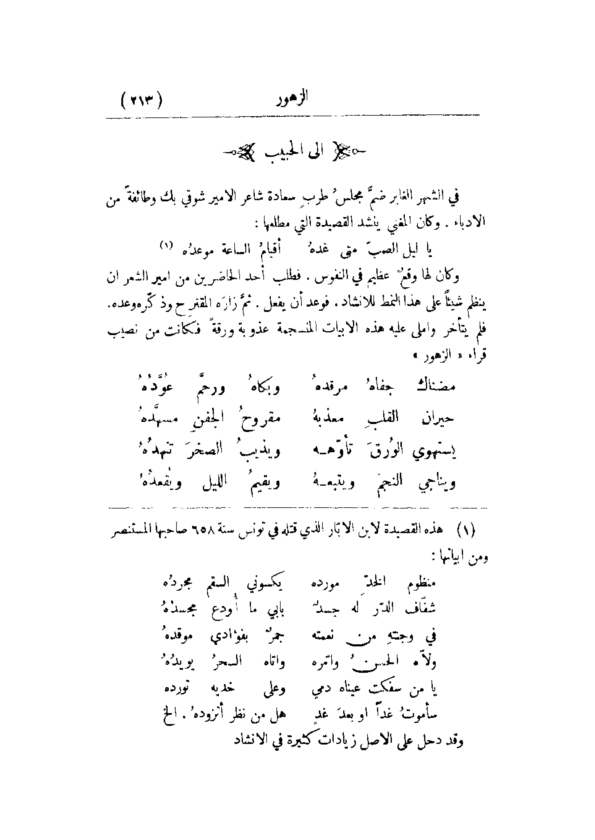 هذا النمط للإنشاد. فوعد أن يفعل. ثم زاره المقترح وذكره وعده. فلم يتأخر وأملى عليه هذه الأبيات المنسجمة عذوبة ورقة فكانت من نصيب قراء الزهور