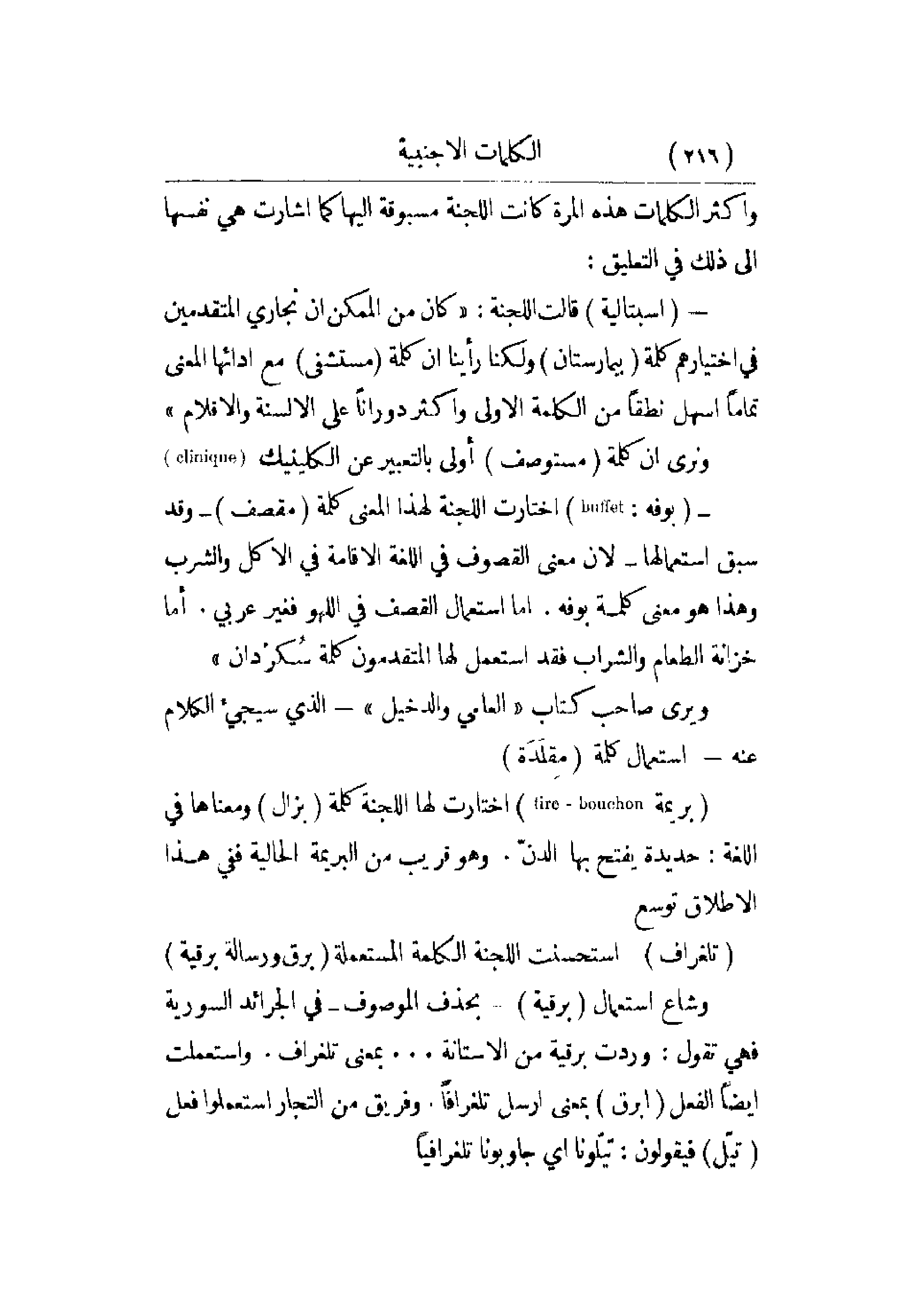 - (اسبتالية) قالت اللجنة: كان من الممكن أن نجاري المتقدمين في اختيارهم كلمة (بيمارستان) ولكنا رأينا أن كلمة (مستشفى) مع أدائها المعنى تماماً أسهل نطقاً من الكلمة الأولى وأكثر دوراناً على الألسنة والأقلام