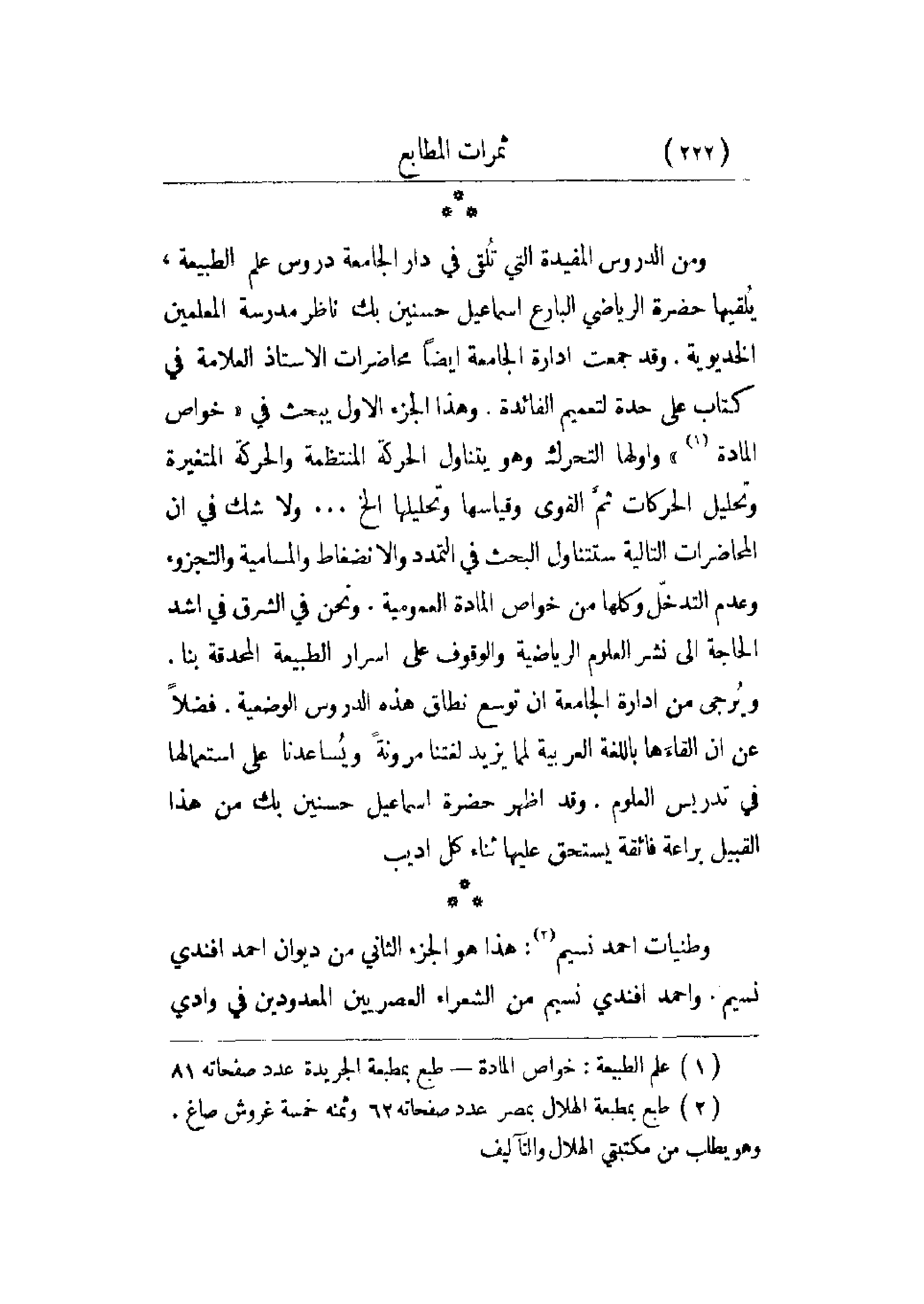 ومن الدروس المفيدة التي تلقى في دار الجامعة دروس علم الطبيعة، يلقيها حضرة الرياضي البارع إسماعيل حسنين بك ناظر مدرسة المعلمين الخديوية. وقد جمعت إدارة الجامعة أيضاً محاضرات الأستاذ العلامة في كتاب على حدة لتعميم الفائدة. وهذا الجزء الأول يبحث في خواص المادة وأولها التحرك وهو يتناول الحركة المنتظمة والحركة المتغيرة وتحليل الحركات ثم القوة وقياسها وتحليلها إلخ. . . ولاشك في أن المحاضرات التالية ستتناول البحث في التمدد والانضغاط والمسامية والتجزؤ وعدم التدخل وكلها من خواص المادة العمومية. ونحن في الشرق في أشد الحاجة إلى نشر العلوم الرياضية والوقوف على أسرار الطبيعة المحدقة بنا. ويرجى من إدارة الجامعة أن توسع نطاق هذه الدروس الوضعية. فضلاً عن أن إلقاءها باللغة العربية لمما يزيد لغتنا مرونة ويساعدنا على استعمالها في تدريس العلوم. وقد اظهر حضرة إسماعيل حسنين بك من هذا القبيل براعة فائقة يستحق عليها ثناء كل أديب.