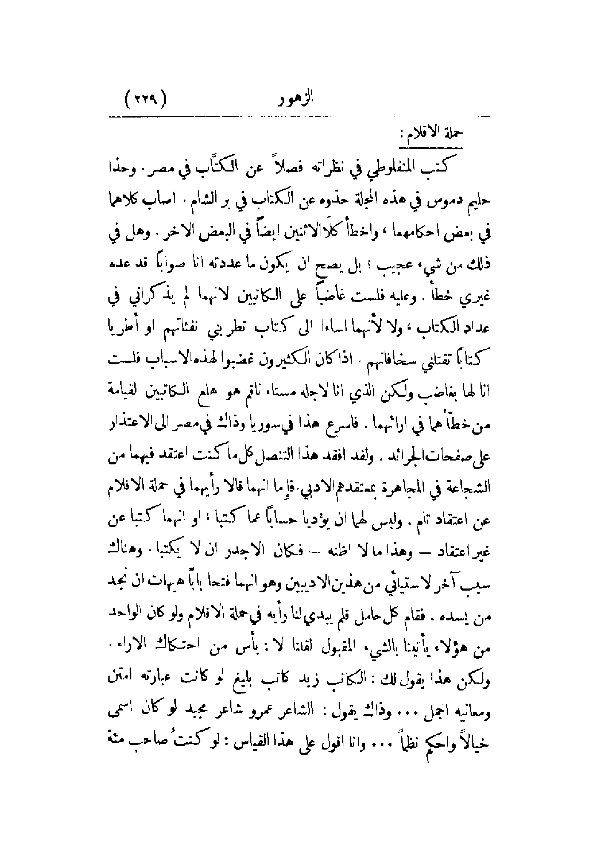 كتب المنفلوطي في نظراته فصلاً عن الكتاب في مصر. وحذا حليم دموس في هذه المجلة حذوه عن الكتاب في بر الشام. أصاب كلاهما في بعض أحكامهما، وأخطأ كلا الاثنين أيضاً في البعض الآخر. وهل في ذلك من شيء عجيب؟ بل يصح أن يكون ما عددته أنا صواباً قد عده غيري خطأ. وعليه فلست غاضباً على الكاتبين لأنهما لم يذكراني في عداد الكتاب، ولا لأنهما أساءا إلى الكتاب تطربني نفثاتهم أو أطربا كتاباً تقتلني سخافاتهم. إذا كان الكثيرون غضبوا لهذه الأسباب فلست أنا لها بغاضب ولكن الذي أنا لأجله مستاء ناقم هو هلع الكاتبين لقيامة من خطأهما في آرائهما. فأسرع هذا في سورية وذاك في مصر إلى