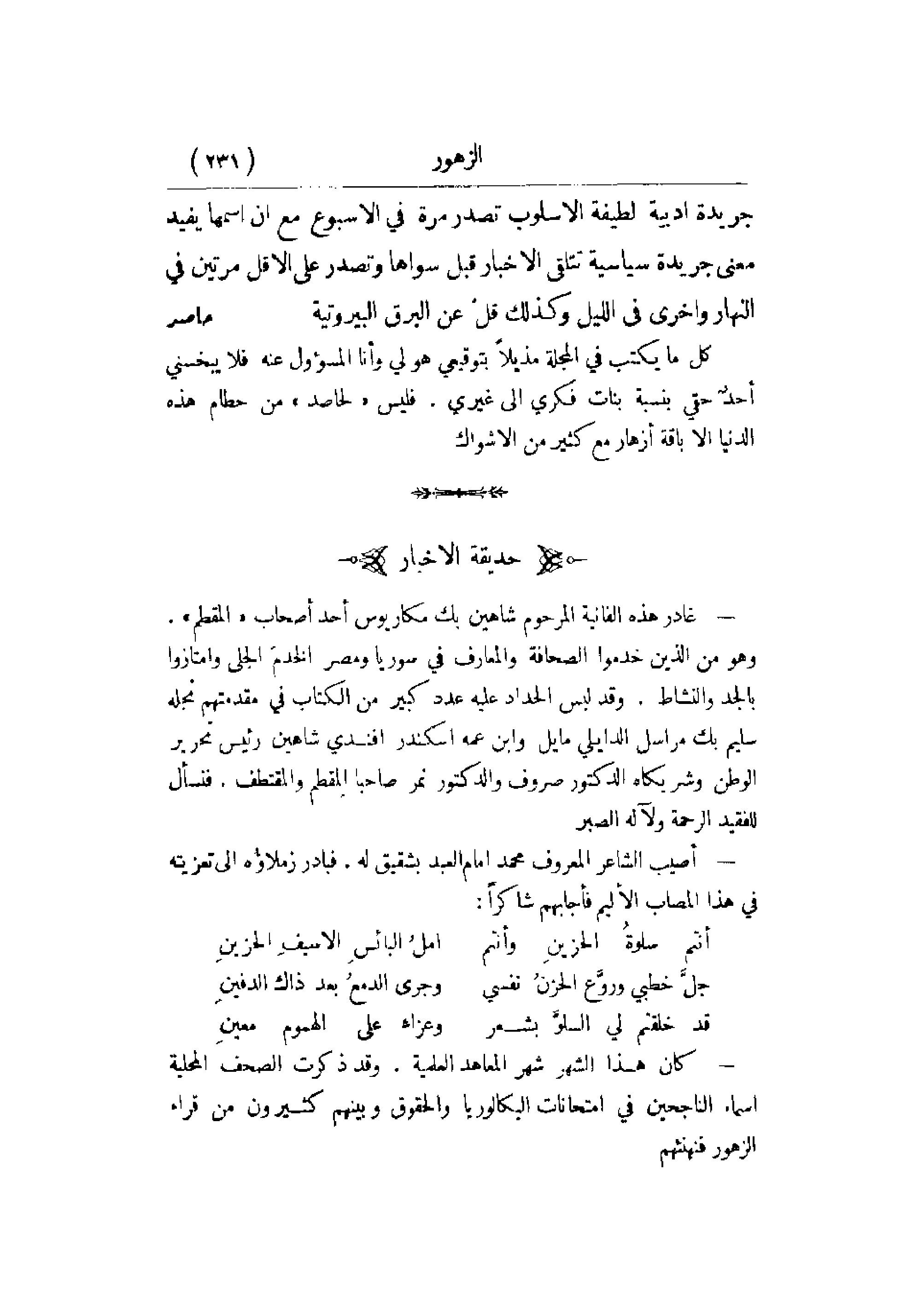- كان هذا الشهر شهر المعاهد العلمية. وقد ذكرت الصحف المحلية أسماء الناجحين في امتحانات البكالوريا والحقوق وبينهم كثيرون من قراء الزهور فنهنئهم.