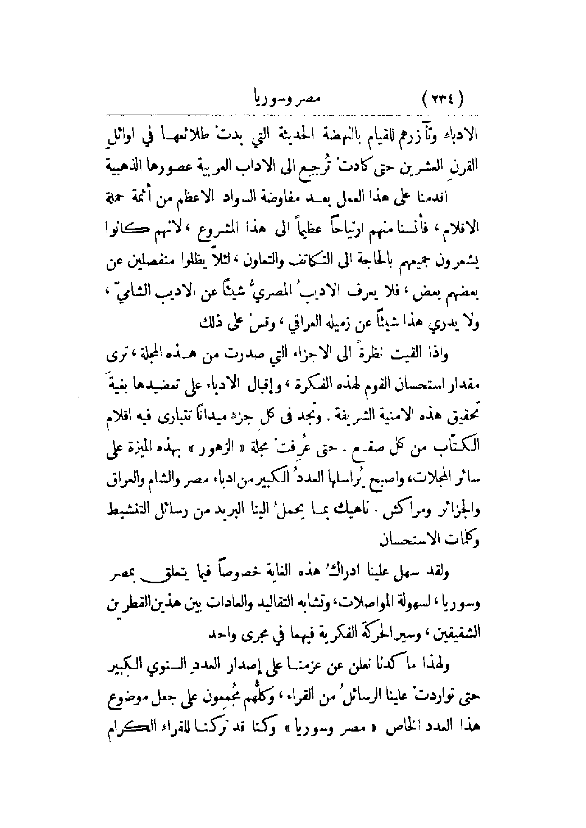 ولقد سهل علينا إدراك هذه الغاية خصوصاً فيما يتعلق بمصر وسوريا، لسهولة الموصلات، وتشابه التقاليد والعادات بين هذين القطرين الشقيقين، وسير الحركة الفكرية فيهما في مجرى واحد.