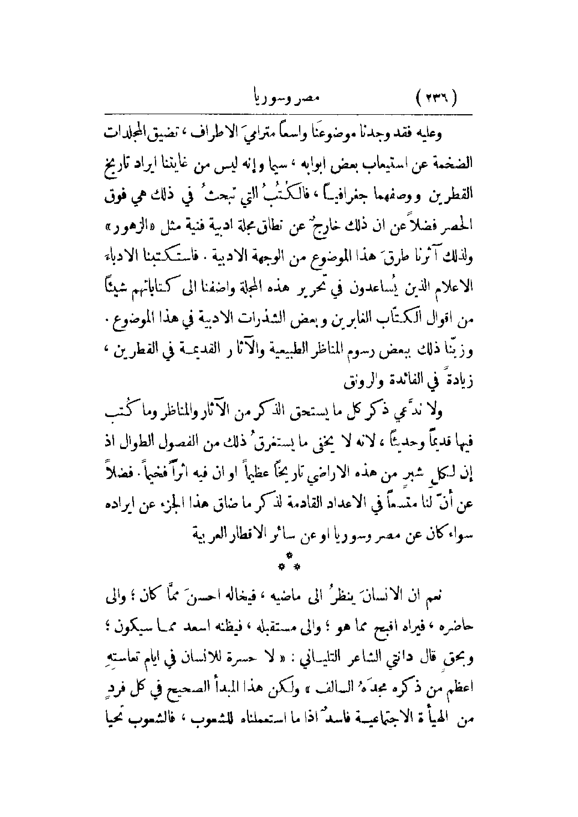ولا ندعي ذكر كل ما يستحق الذكر من الآثار والمناظر وما كتب فيها قديماً وحديثاً، لأنه لا يخفى ما يستغرق ذلك من الفصول الطوال إذ إن لكل شبر من هذه الأراضي تاريخاً عظيماً أو أن فيه أثراً فخيماً. فضلاً عن أن لنا متسعاً في الأعداد القادمة لذكر ما ضاق هذا الجزء عن إيراده سواء كان عن مصر وسوريا أو عن سائر الأقطار العربية.