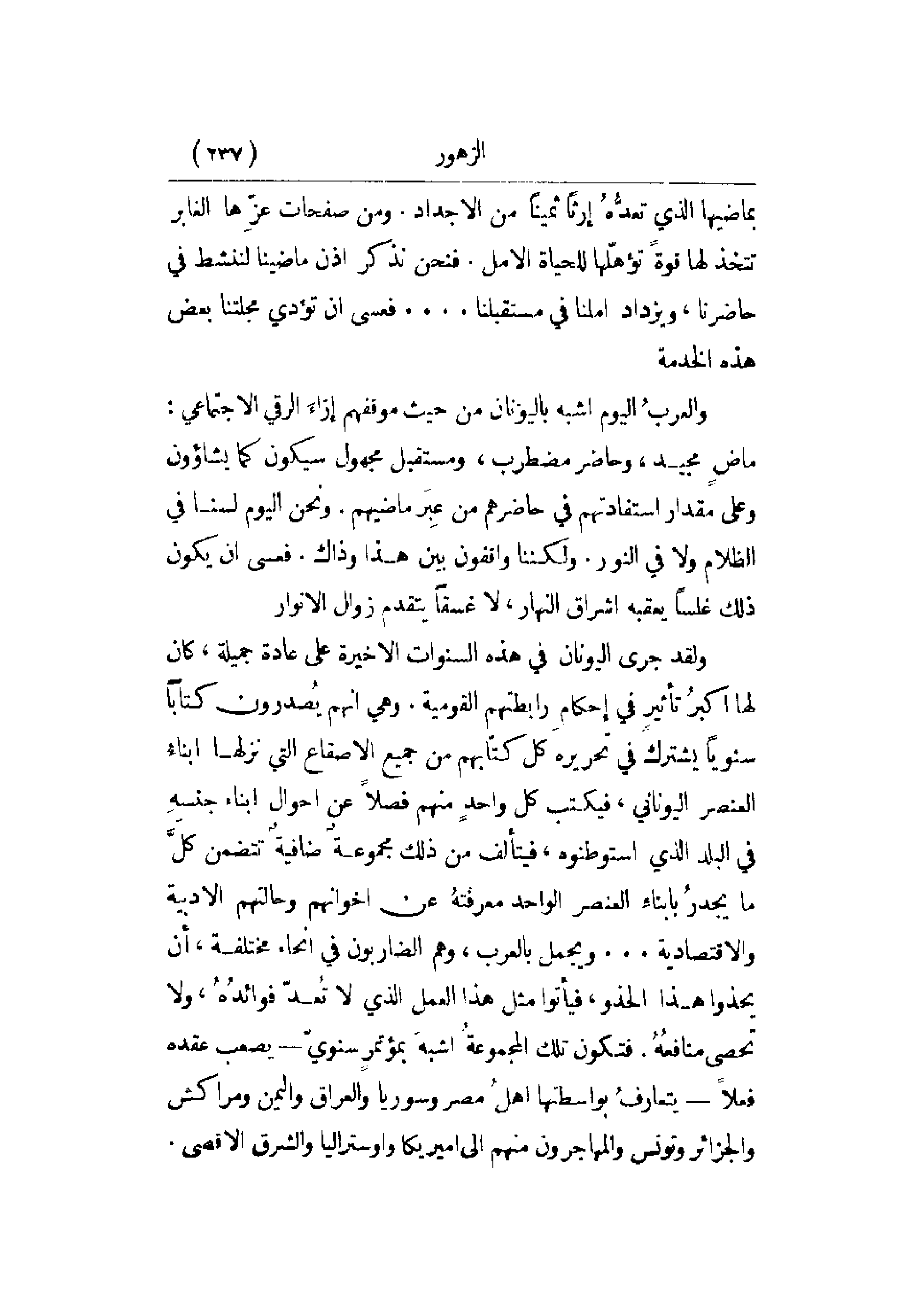 ولقد جرى اليونان في هذه السنوات الأخيرة على عادة جميلة، كان لها أكبر تأثير في إحكام رابطتهم القومية. وهي أنهم يصدرون كتاباً سنوياً يشترك في تحريره كل كتابهم من جميع الأصقاع التي نزلها أبناء العنصر اليوناني، فيكتب كل واحد منهم فصلاً عن أحوال أبناء جنسه في البلد الذي استوطنوه، فيتألف من ذلك مجموعة ضافية تتضمن كل ما يجدر بأبناء العنصر الواحد معرفته عن إخوانهم وحالتهم الأدبية والاقتصادية. . . ويجمل بالعرب، وهم الضاربون في أنحاء مختلفة، أن يحذوا هذا الحذو، فيأتوا مثل هذا العمل الذي لا تعد فوائده، ولا تحصى منافعه. فتكون تلك المجموعة أشبه بمؤتمر سنوي - يصعب عقده فعلاً - يتعارف بواسطتها أهل مصر وسوريا والعراق واليمن ومراكش والجزائر وتونس والمهاجرون منهم إلى أمريكا وأستراليا والشرق الأقصى
