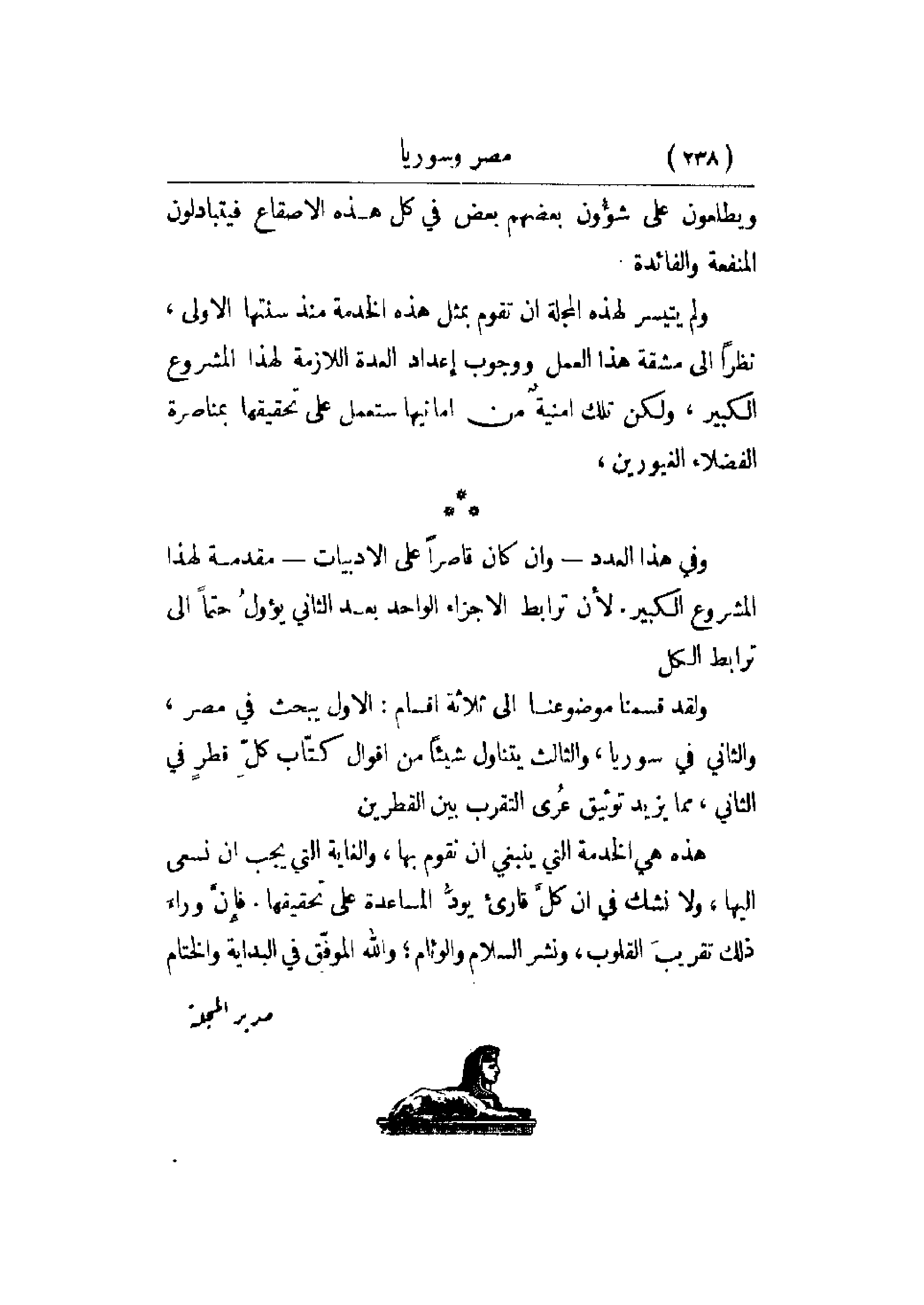 ولقد قسمنا موضوعنا إلى ثلاثة أقسام: الأول يبحث في مصر، والثاني في سوريا، والثالث يتناول شيئاً من أقوال كتاب كل قطر في الثاني، مما يزيد توثيق عرى التقرب بين القطرين.