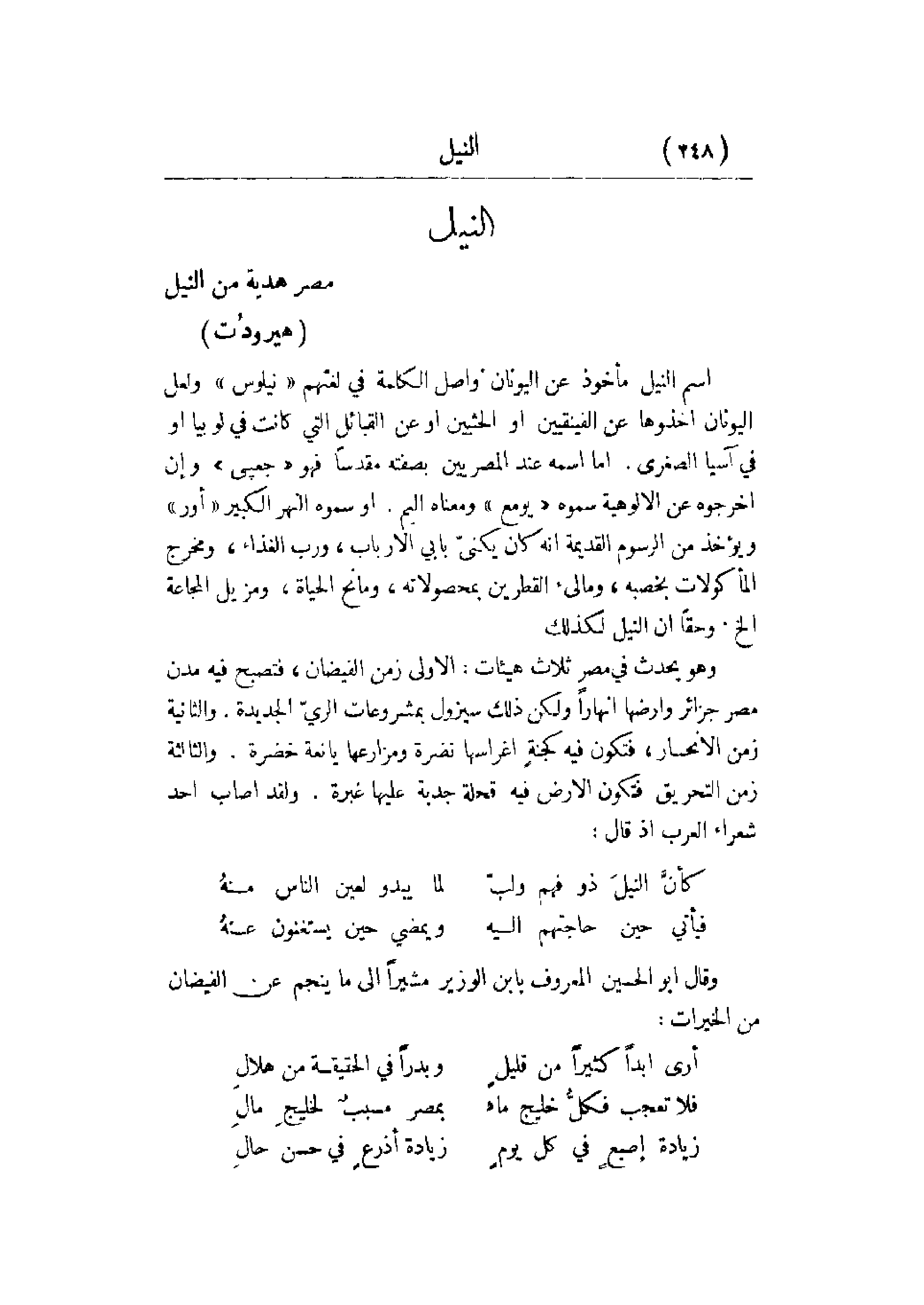 وهو يحدث في مصر ثلاث هيئات: الأولى زمن الفيضان، فتصبح فيه مدن مصر جزائر وأرضها أنهاراً ولكن ذلك سيزول بمشروعات الري الجديدة. والثانية زمن الانحسار، فتتكون فيه كجنة أغراسها نضرة ومزارعها يانعة خضرة. والثالثة زمن التحريق فتكون الأرض فيه قحلة جدبة عليها غبرة. ولقد أصاب أحد شعراء العرب إذ قال: