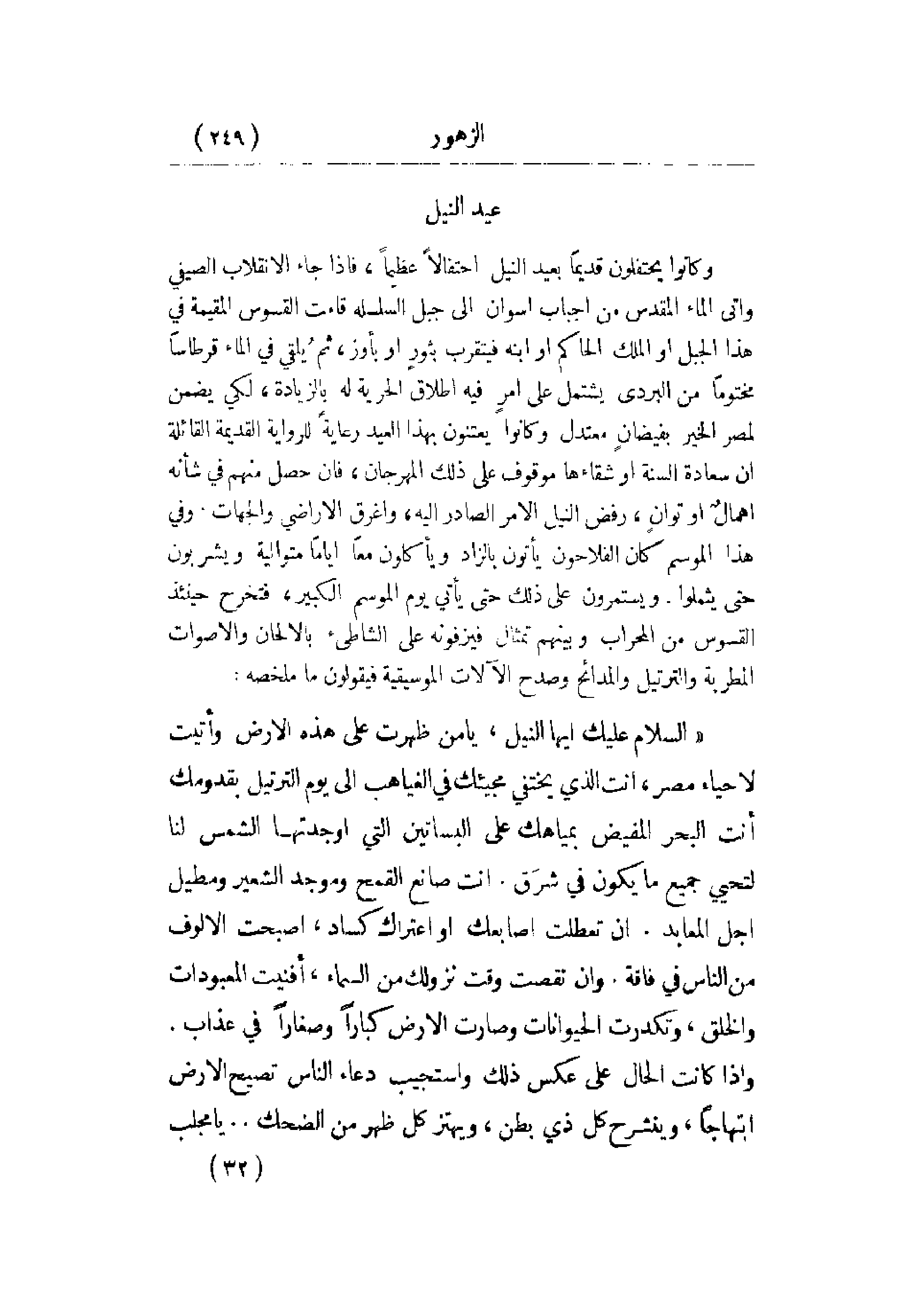 المهرجان، فإن حصل منهم في شأنه إهمال أو توانٍ، رفض النيل الأمر الصادر إليه، وأغرق الأراضي والجهات. وفي هذا الموسم كان الفلاحون يأتون بالزاد ويأكلون معاً أياماً متوالية ويشربون حتى يثملوا. ويستمرون على ذلك حتى يأتي يوم الموسم الكبير، فتخرج حينئذ القسوس من المحراب وبينهم تمثال فيزفونه على الشاطئ بالألحان والأصوات المطربة والترتيل والمدائح وصدح الآلات الموسيقية فيقولون ما ملخصه: