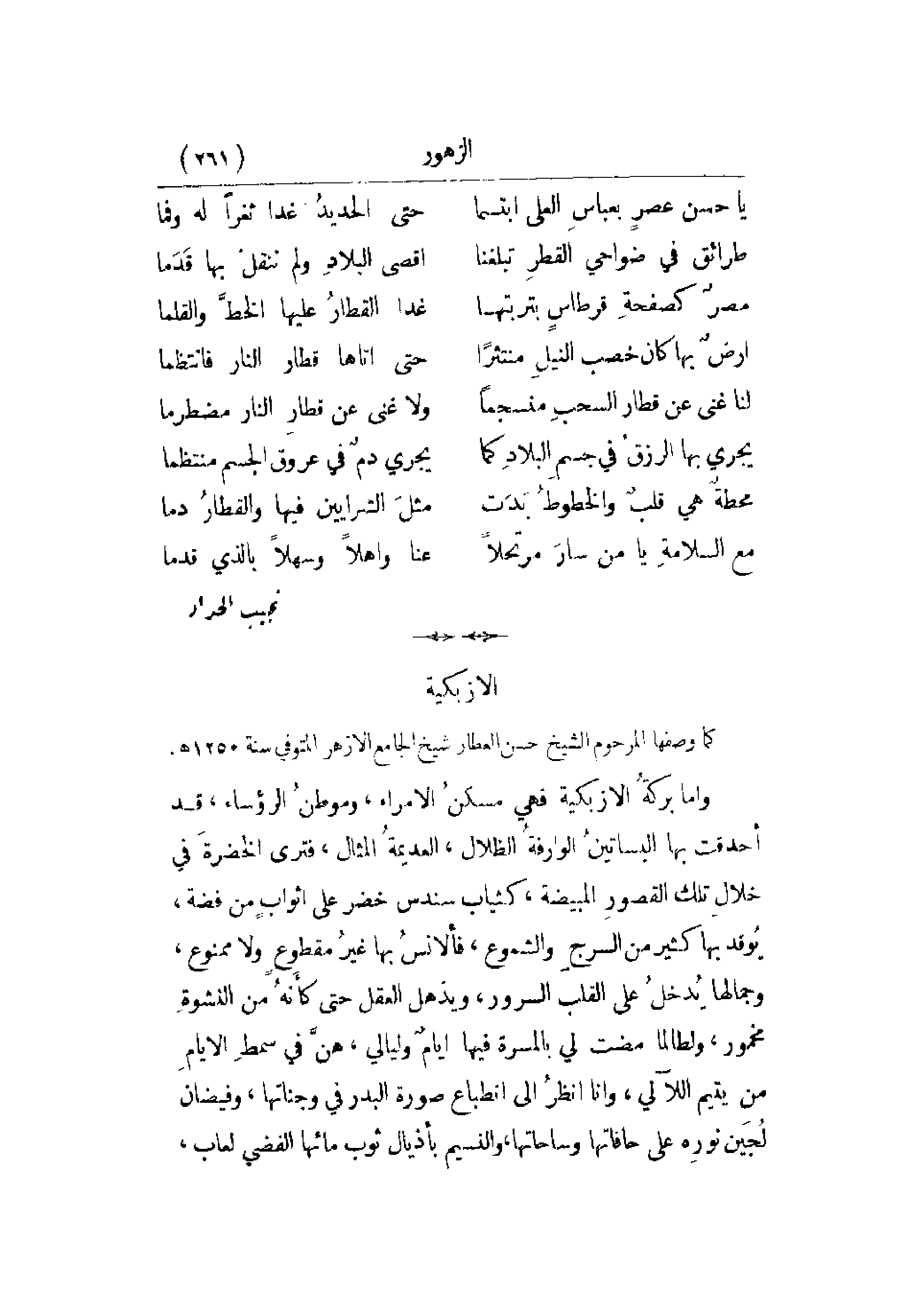 وأما بركة الأزبكية فهي مسكن الأمراء، وموطن الرؤساء، قد أحدقت بها البساتين الوارفة الظلال، العديمة المثال، فترى الخضرة في خلال تلك القصور المبيضة، كثياب سندس خضر على أثواب من فضة، يوقد بها كثير من السرج والشموع، فألانس بها غير مقطوع ولا ممنوع، وجمالها يدخل على القلب السرور، ويذهل العقل حتى كأنه من النشوة مخمور، ولطالما مضت لي بالمسرة فيها أيام وليالي، هن في سمط الأيام من يتيم اللآلي، وأنا أنظر إلى انطباع صورة البدر في وجناتها، وفيضان لجين نوره على حافاتها وساحاتها، والنسيم بأذيال ثوب مائها الفضي لعاب،