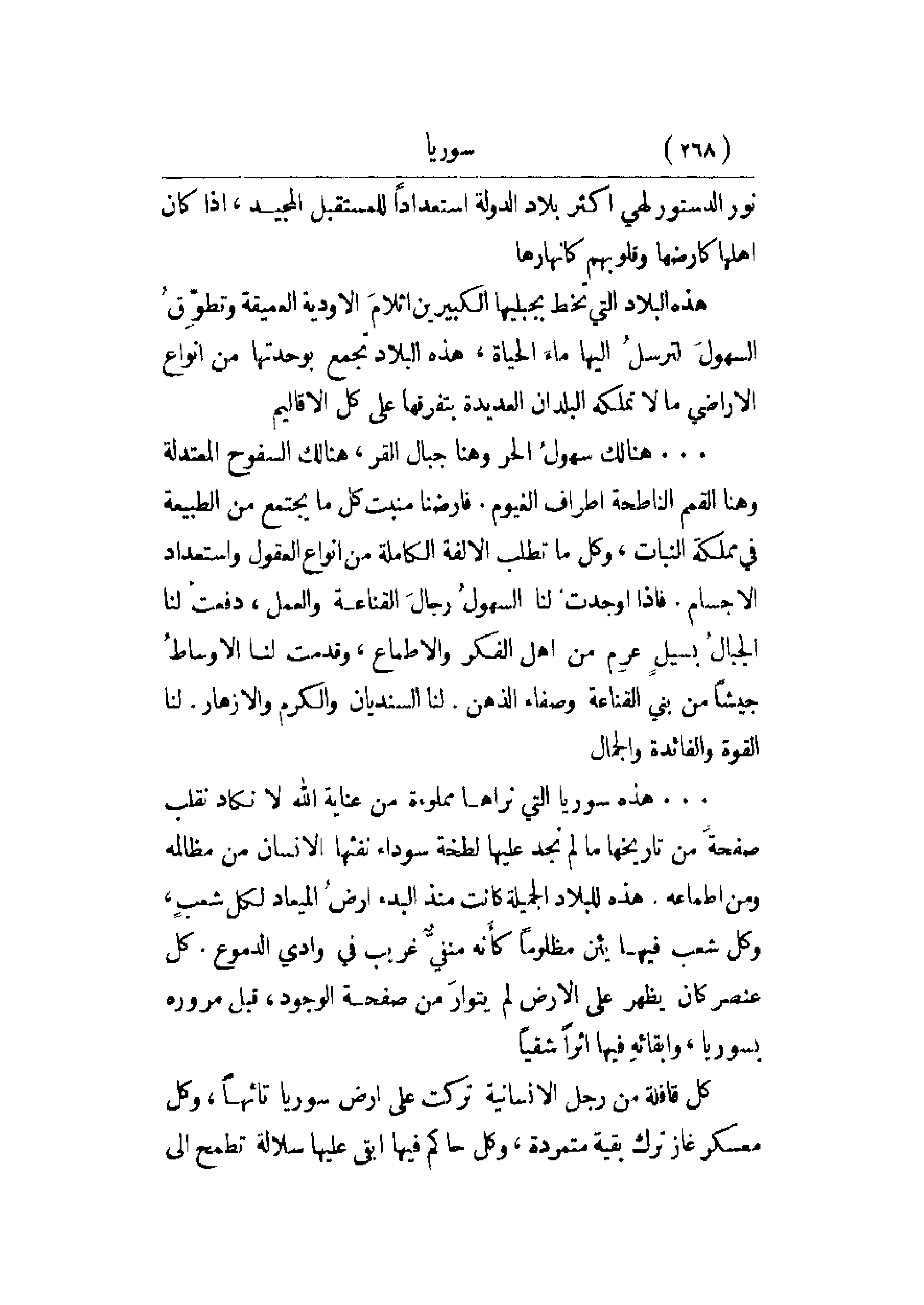 . . . هذه سورية التي نراها مملوءة من عناية الله لا نكاد نقلب صفحة من تاريخها ما لم نجد عليها لطخة سوداء نفثها الإنسان من مظالمه ومن أطماعه. هذه للبلاد الجميلة كانت منذ البدء أرض الميعاد لكل شعب، وكل شعب فيها يئن مظلوماً كأنه منفي غريب في وادي