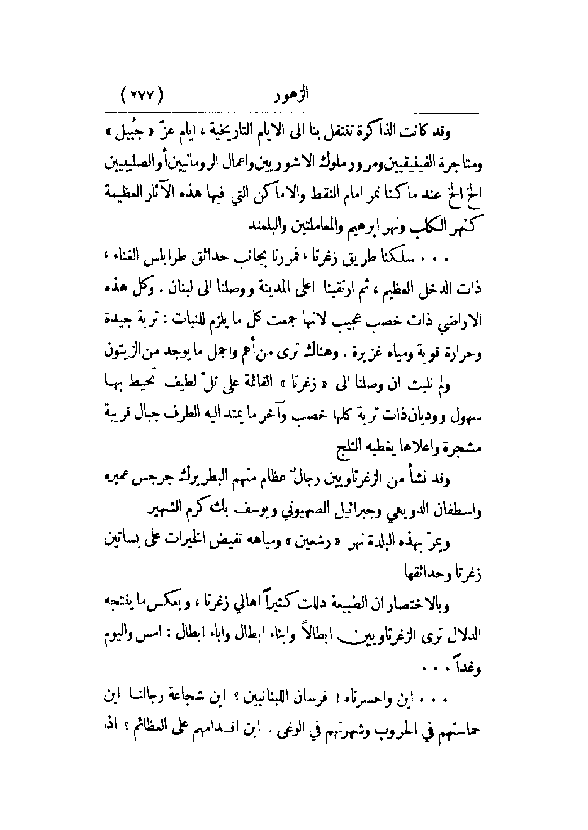 ولم نلبث أن وصلنا إلى زغرتا القائمة على تل لطيف تحيط بها سهول ووديان ذات تربة كلها خصب وآخر ما يمتد إليه الطرف جبال قريبة مشجرة وأعلاها يغطيه الثلج.
