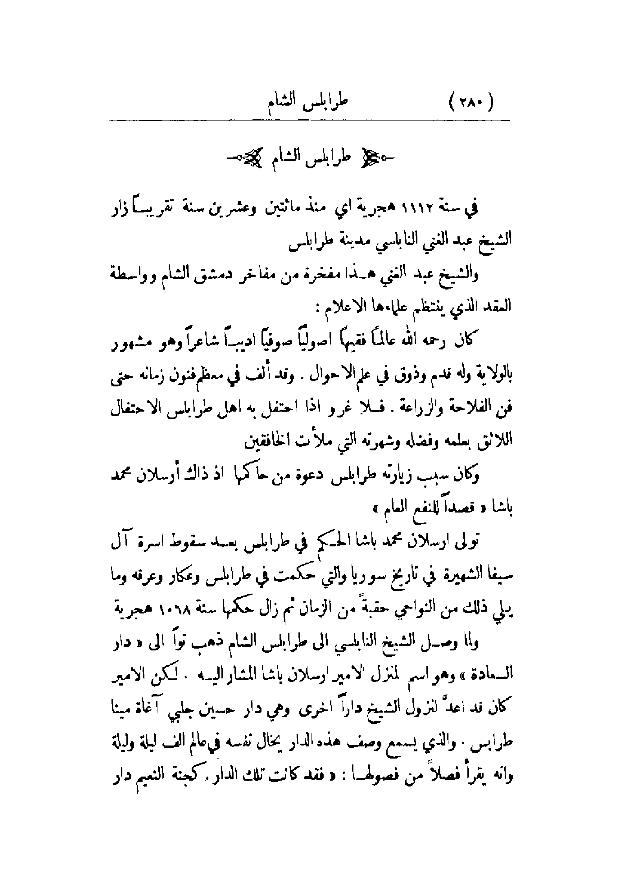 في سنة 1112 هجرية أي منذ مائتين وعشرين سنة تقريباً زار الشيخ عبد الغني النابلسي مدينة طرابلس.