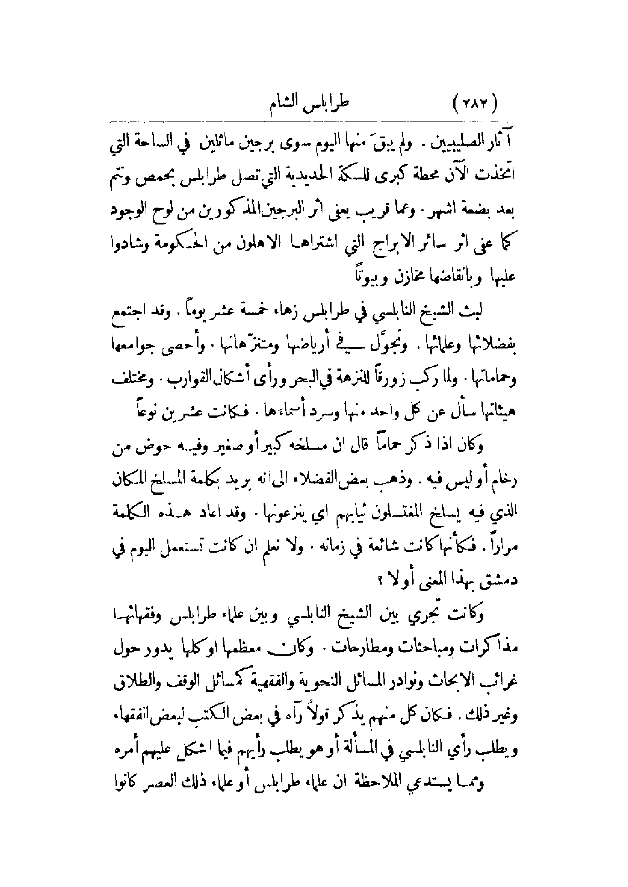 آثار الصليبيين. ولم يبق منها اليوم سوى برجين ماثلين في الساحة التي اتخذت الآن محطة كبرى للسكة الحديدية التي تصل طرابلس بحمص وتتم بعد بضعة أشهر. وعما قريب يعفى أثر البرجين المذكورين من لوح الوجود كما عفي أثر سائر الأبراج التي اشتراها الأهلون من الحكومة وشادوا عليها وبأنقاضها مخازن وبيوتاً.
