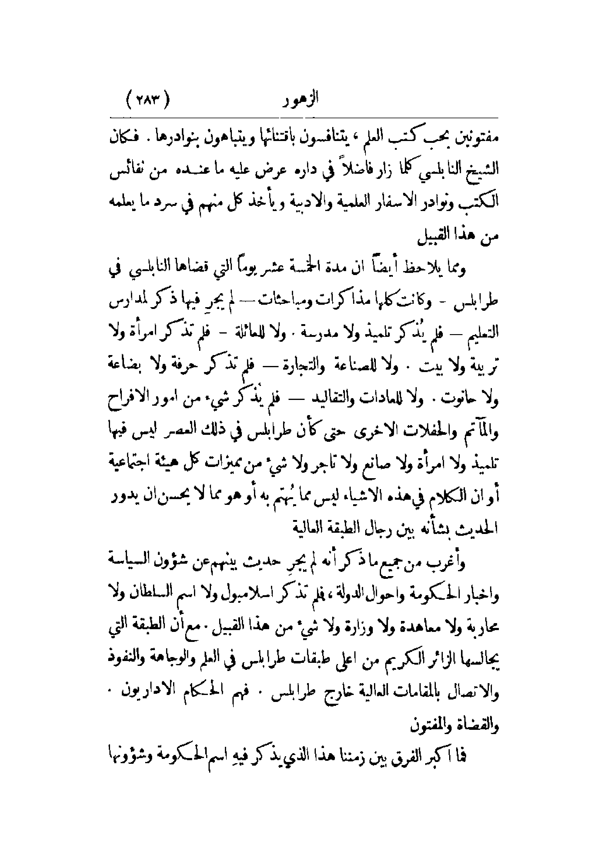وأغرب من جميع ما ذكر أنه لم يجر حديث بينهم عن شؤون السياسة وأخبار الحكومة وأحوال الدولة، فلم تذكر أسلامبول ولا اسم السلطان ولا محاربة ولا معاهدة ولا وزارة ولا شيء من هذا القبيل. مع أن الطبقة التي يجالسها الزائر الكريم من أعلى طبقات طرابلس في العلم والوجاهة والنفوذ والاتصال بالمقامات العالية خارج طرابلس. فهم الحكام الإداريون. والقضاة والمفتون.
