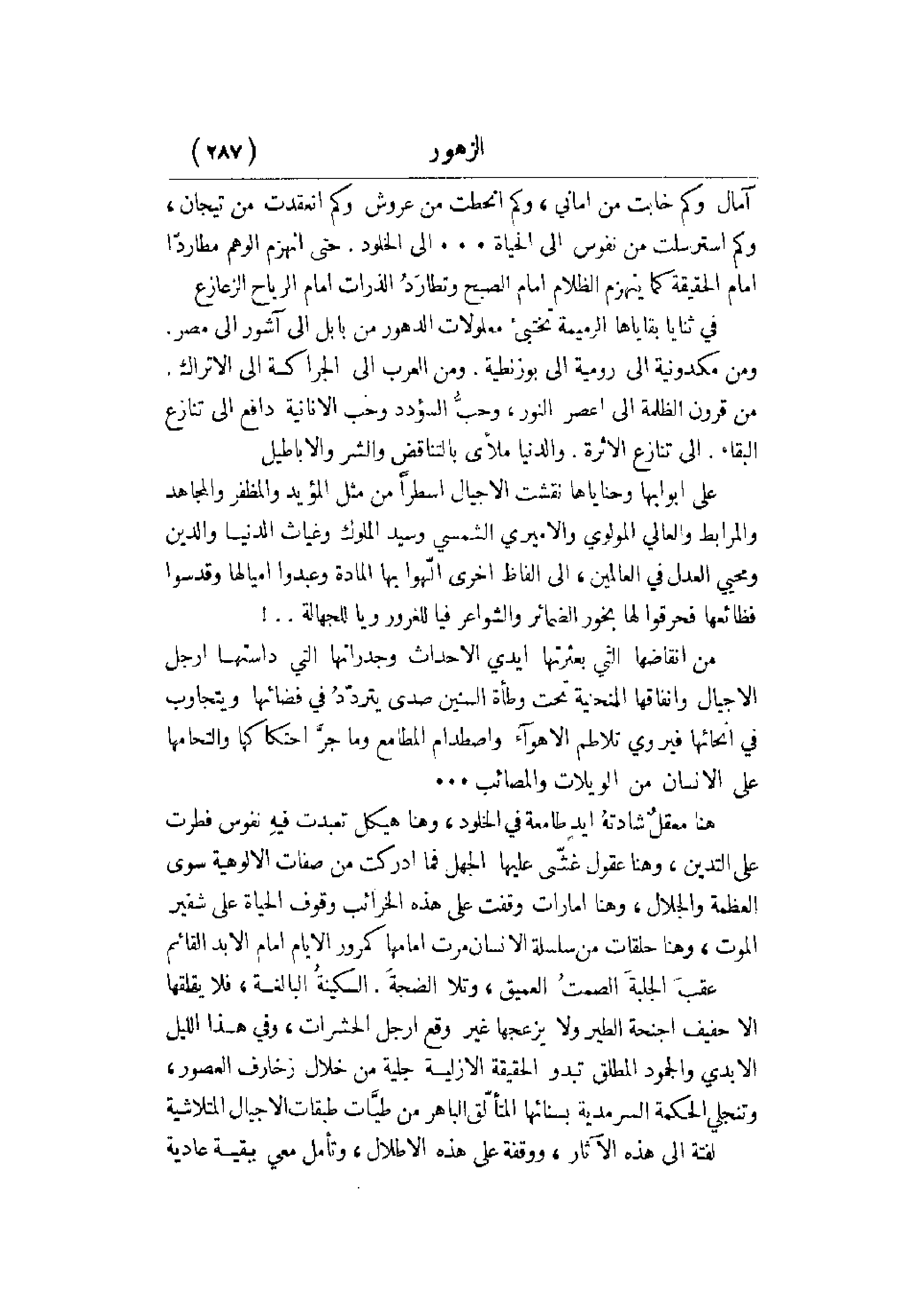 هنا معقل شادته أيد طامعة في الخلود، وهنا هيكل تعبدت فيه نفوس فطرت على التدين، وهنا عقول غشى عليها الجهل فما أدركت من صفات الألوهية سوى العظمة والجلال، وهنا غمارات وقفت على هذه الخرائب وقوف الحياة على شفير الموت، وهنا حلقات من سلسلة الإنسان مرت أمامها كمرور الأيام الأبد القائم.