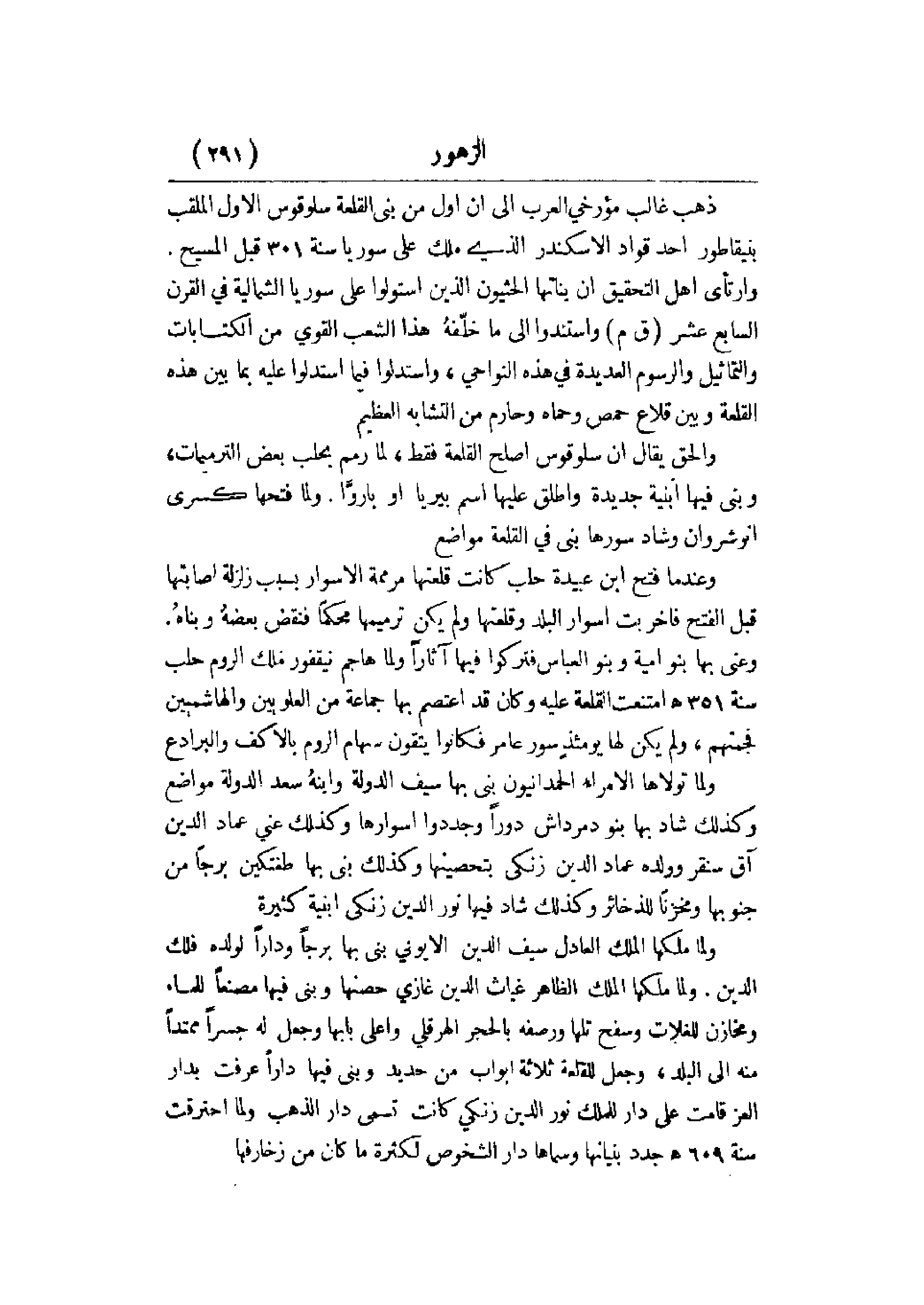 ولما تولاها الأمراء الحمدانيون بنى فيها سيف الدولة وابنه سعد الدولة مواضع وكذلك شاد بها بنو دمرداش دوراً وجددوا أسوارها وكذلك عني عماد الدين آق سنقر وولده عماد الدين زنكي بتحصينها وكذلك بنى بها طغتكين برجاً من جنوبها وخزناً للذخائر وكذلك شاد فيها نور الدين زنكي أبنية كثيرة.