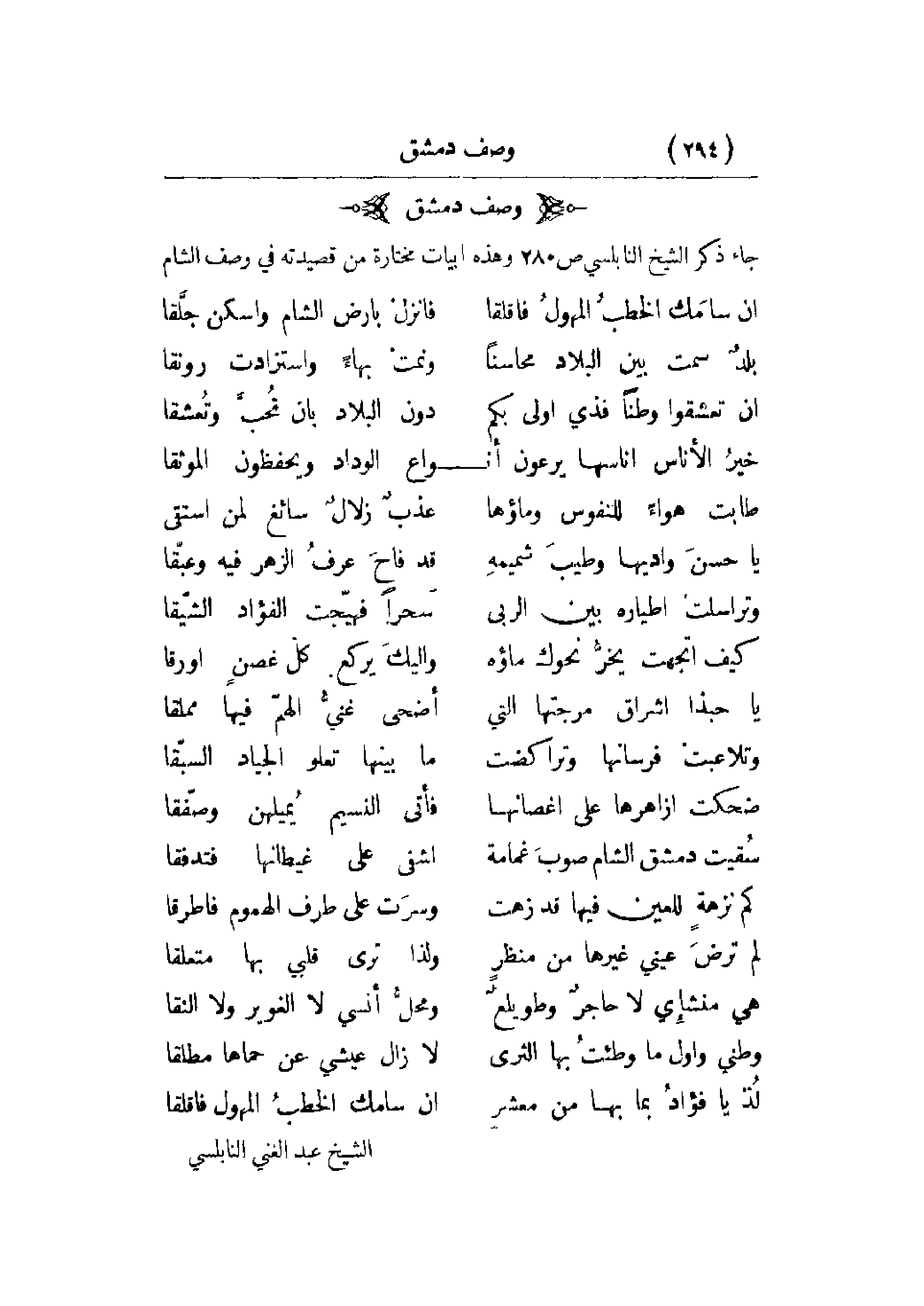 جاء ذكر الشيخ النابلسي ص 280 وهذه أبيات مختارة من قصيدته في وصف الشام: